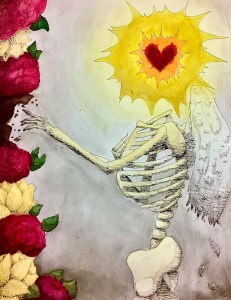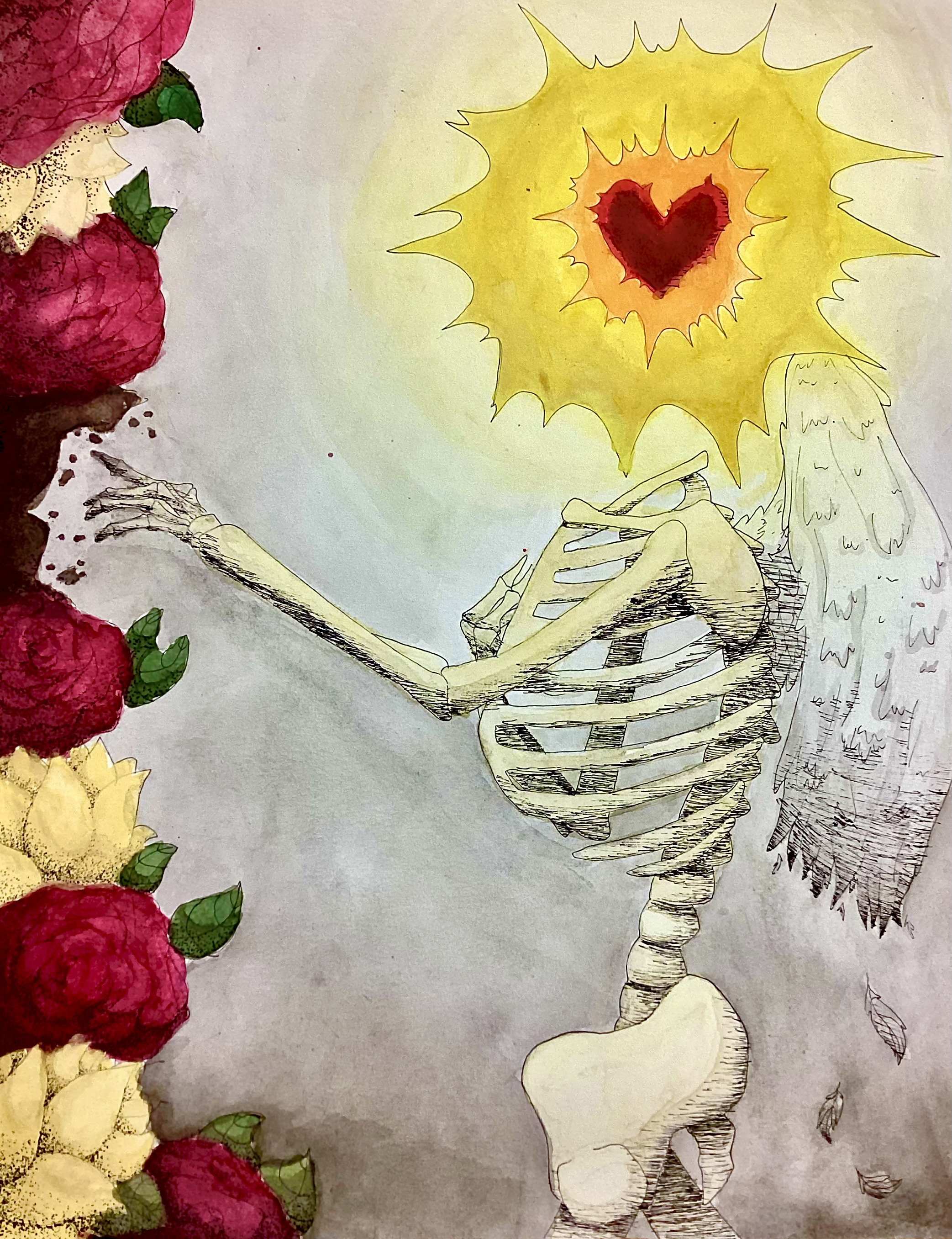 “My project is about Polygamy, the act of three or more people being married to each other, which is illegal in the United States. I believe that Polygamy should be legalized everywhere, which is why I made my art seem mournful and depressing. The symbolism I used was flowers to represent two lovers, and a skeleton to represent a third. As the skeleton is reaching for the flowers, they are turning to ash the closer the hand gets. This helps show that the three are not allowed to be together, because their love is illegal. I chose this social justice issue because I believe that as long as relationships are happy and consensual, they should be legal. Love is very important, and should not be any one’s business except those involved in the relationship.”