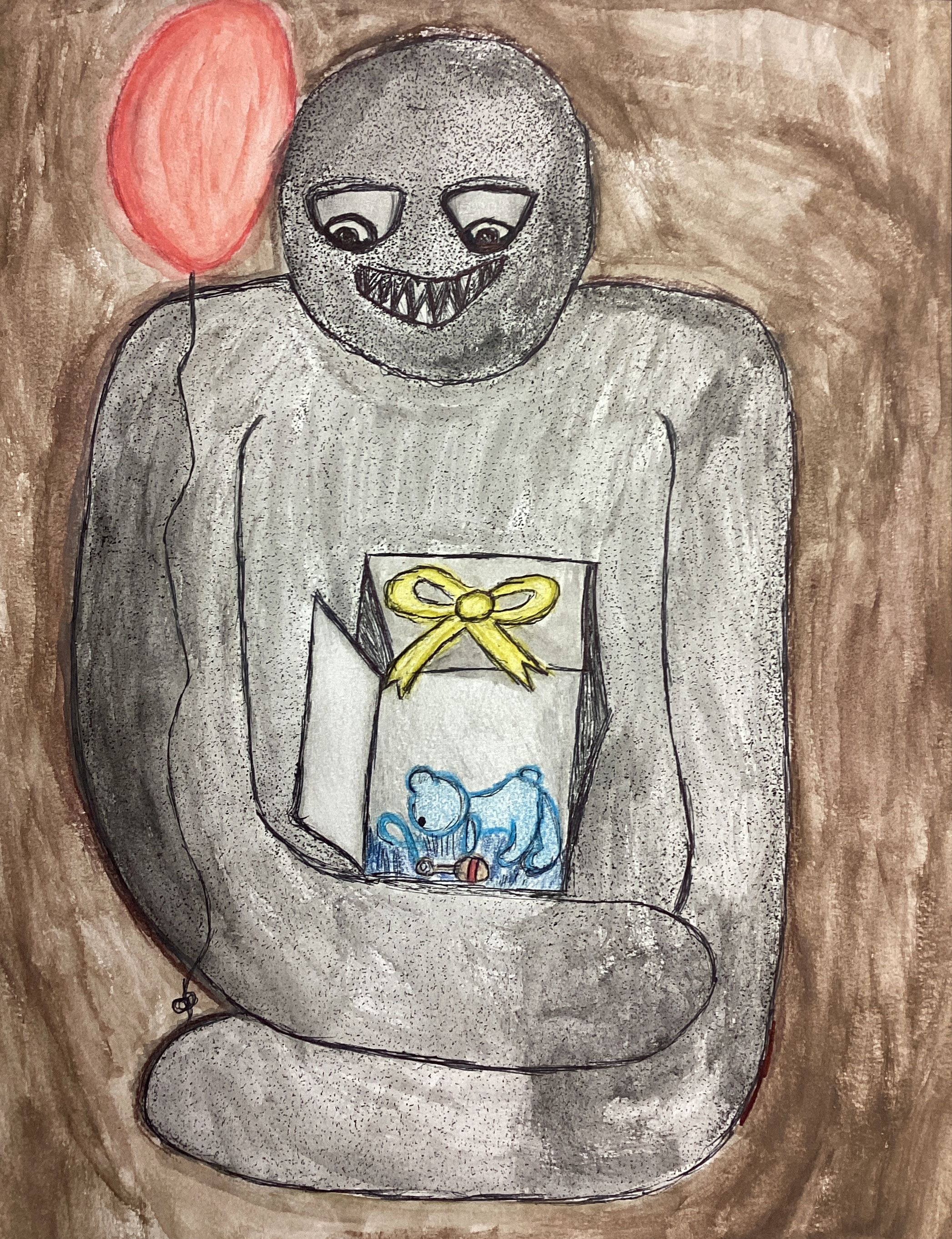 “My piece is about Shadow of the Innocence. Sexual assault continues to traumatize a lot of people around the world. No matter what gender or age, people can’t seem to escape the pattern of harassment. Sexual harassment is something people cannot necessarily help prevent. It’s hard to realize that you can barely go anywhere alone. I wanted to make the figure in my drawing to look creepy in a way that still maintains a child friendly center. I wanted the shadowy figure to feel standoffish. I wanted the background to feel like a memory. The aura around the shadow figure is supposed to feel like a lost memory that one wants to keep away.”