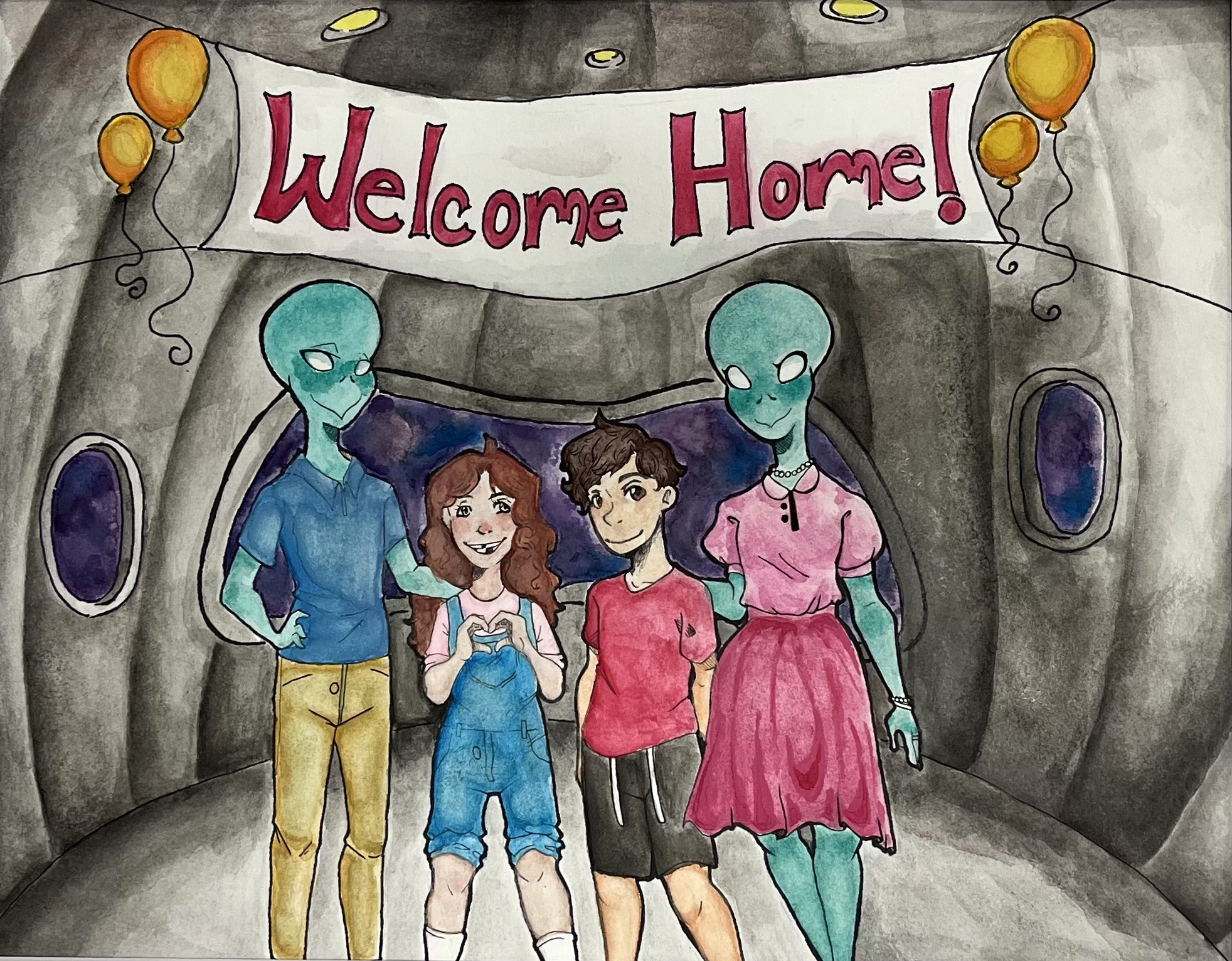 “My piece represents a family comprised of two alien parents and two human children. It is still a family, even if made up of different kinds of people, and even if not blood related. The spaceship that they are standing in is to point that every home is different. Not every family lets their child know they are adopted, but I am glad I had been told about it myself. I would much rather know that my family loved me enough to take me in of their own choice than to simply take such a thing for granted. I hope that my piece would encourage people to embrace adoption, by accepting it more or even in a more personal manner as it is nothing to be ashamed of.”