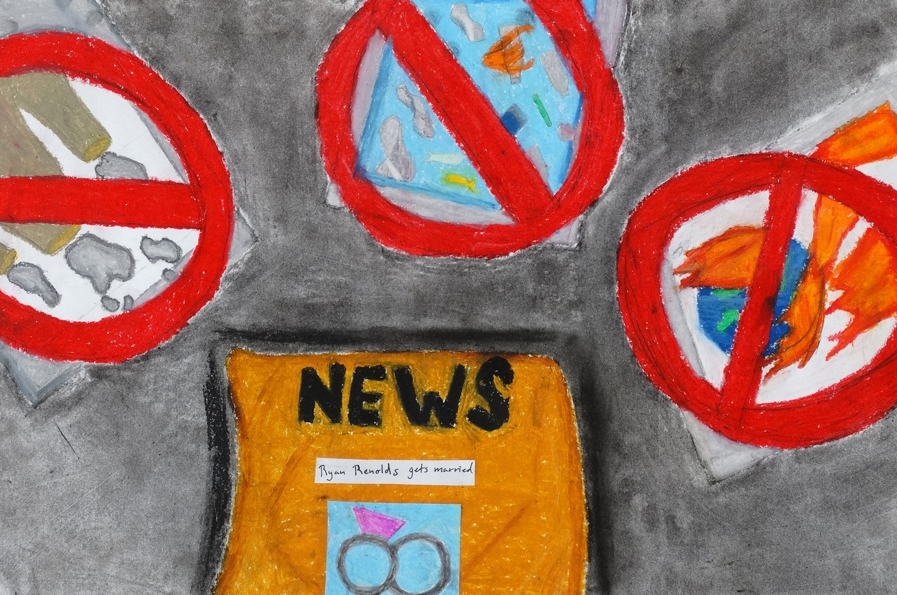 “This work is portraying how the world reacts to the important things, such as pollution, versus the not so important things, such as a celebrity’s marriage. Our world today would rather read an article about Chris Brown than read about the dangers of pollution. The dangers of water and air pollution, and global warming, are very important to learn about, yet no one wants to participate in talking, writing, or reading about them to make the world a better place.”
