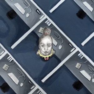 “In my piece, “Cubicles,” I wanted to represent the importance of self-expression and having a voice in society, whether in a school environment, at home, or in the work place. I focused on an office space, to give a mundane representation of being unseen or fitting into the norm of societal expectations; and I chose a child as the subject. The child looks to the viewer as if calling for help or for being seen/heard. The child also contrasts with the more formal/mature office space.”