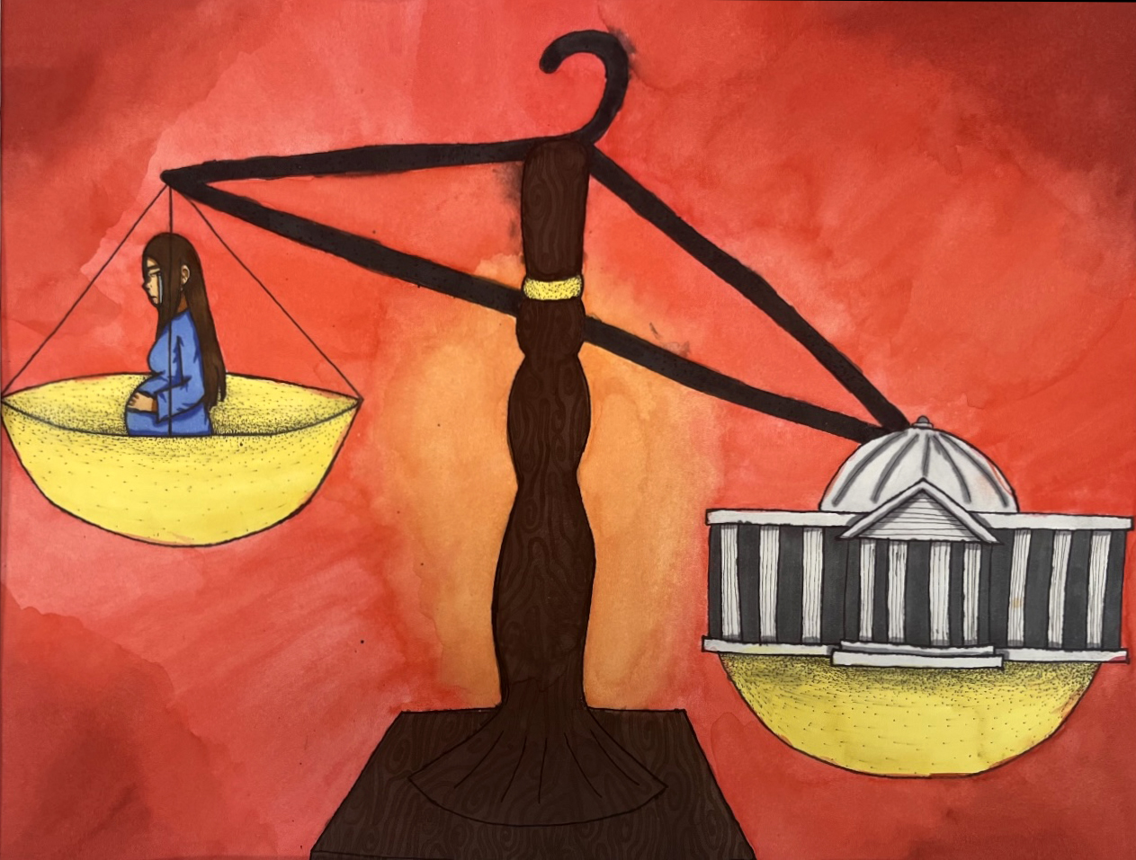 “Women have been fighting for the right to choose over their bodies for a very long time. I’ve always been super passionate about this topic and wanted to show how the government considers itself more important than women. I drew a balance scale with the heavier end holding a government building, and the lighter end holding a woman. I used this symbolism to show how the government is considered more important than women. Women have fought for rights for a long time, and now we are going in the opposite direction with new laws taking away women’s right to choose over their bodies. I believe everyone should have the right to choose.”
