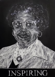 ART PROJECT: “Under the guidance of Art Teacher Jamie Schorsch, students selected an individual, an icon of society, who has impacted and influenced society in a positive way. A term was selected as a descriptor of the selected icon that was included in the work to summarize the individual’s life or characteristics.”
