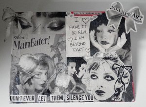 “This piece was created to support and empower women through a collage of black and white pictures on top of a pink background. This piece contains only women and has quotes that are there to motivate and empower them and also help make them feel loved. The sparkle modge podge coat on top helps cover the papery look and gives a more feminine, girly, textbook vibe to it; that and the extra bows thrown around.”