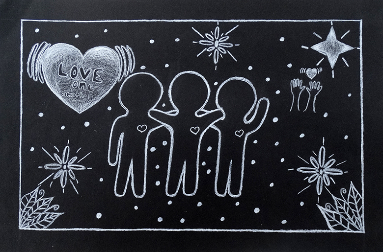“Working under the guidance of art teacher Matt Reed, Princeton HS students grades 9 to 12 studied the work of Keith Haring, an artist known for using simple cartoons to communicate with the viewer. They were asked to draw something with a positive message or to address a social issue with their art. They used white and red colored pencils on black paper, similar to the color scheme in some of Haring’s pieces. The project gave the students a better understanding of how art can be used as a vehicle for personal or political expression.”