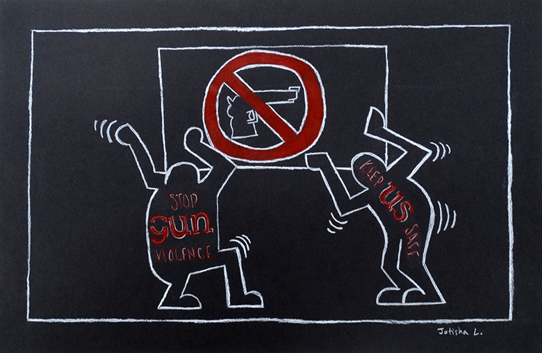 “Working under the guidance of art teacher Matt Reed, Princeton HS students grades 9 to 12 studied the work of Keith Haring, an artist known for using simple cartoons to communicate with the viewer. They were asked to draw something with a positive message or to address a social issue with their art. They used white and red colored pencils on black paper, similar to the color scheme in some of Haring’s pieces. The project gave the students a better understanding of how art can be used as a vehicle for personal or political expression.”