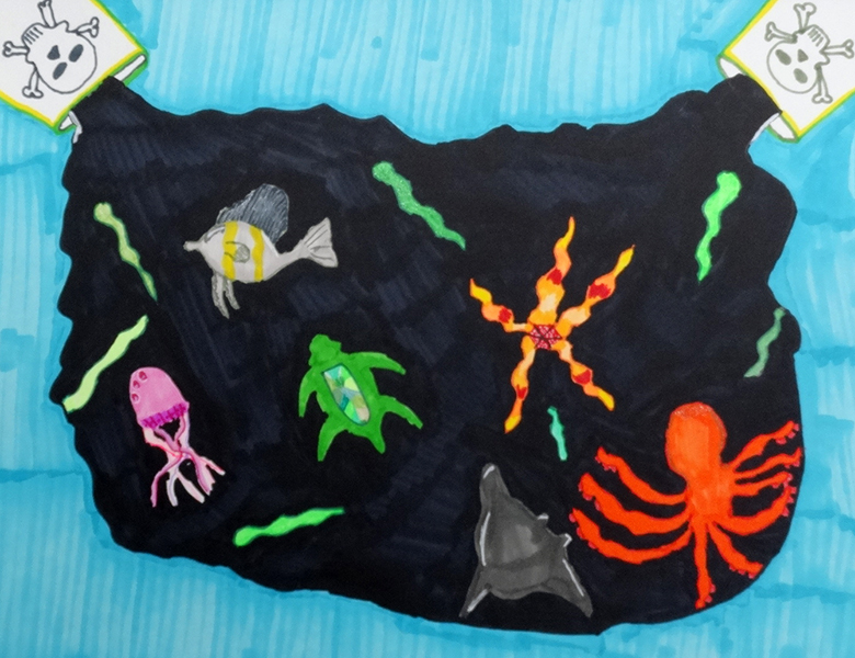 “Oil Spill shows marine life swimming through and oil spill and how they cannot escape the pollutants.”
