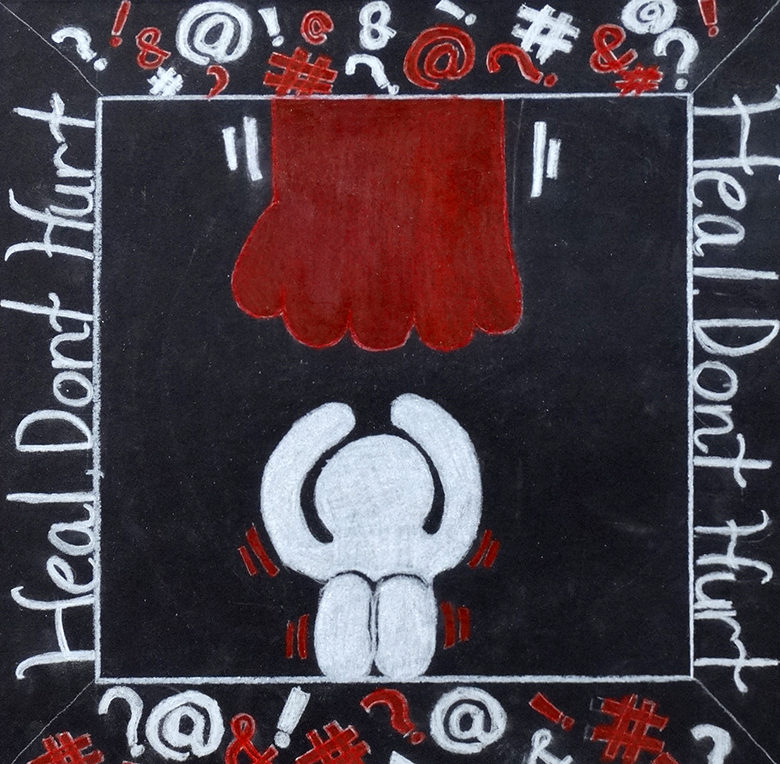 “Guided by either of art teachers Melissa Ambs, Steve Groh, Katie Jacobs, Jamie Schorsch, OHHS students, grades 9 to 12, learned about the graffiti style artwork of Keith Haring, and created a drawing in a similar style using symbolic imagery to communicate a message based on a social issue.”