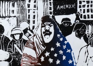 linocut print; 5×7”