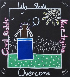 “Guided by either of art teachers Melissa Ambs, Steve Groh, Katie Jacobs, Jamie Schorsch, OHHS students, grades 9 to 12, learned about the graffiti style artwork of Keith Haring, and created a drawing in a similar style using symbolic imagery to communicate a message based on a social issue.”