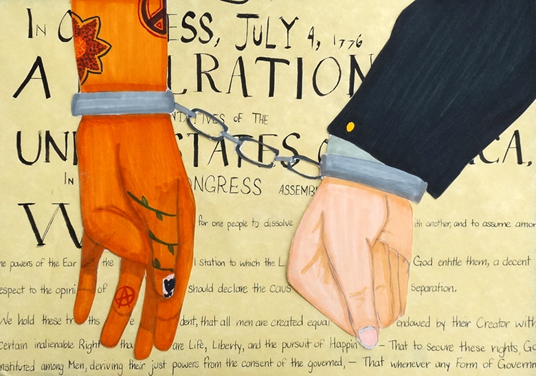 “My piece “Injustice for All,” is a piece that illustrates someone, presumably a punk or social activist being handcuffed by a government official. Behind these two hands is the Declaration of Independence, a document that defies the scene before it. In a world where activism and revolution are looked down upon, to be able to defy what the government expects of you is the root of punk culture. The hand on the left has notable tattoos, some of which including a peace sign for world peace, and the infamous anarchy symbol, a widely known symbol all around the world. The two other tattoos, a vine and a flower, are a symbol for growth and revolution, in the event that a vine overtakes a building or fence, and blooms when it is free. Those who choose to become social nonconformists are bound to the government expectations, where the hand on the right comes in. Overall, the world of injustice overtakes the just future the Founding Fathers dreamed for all Americans to have.”