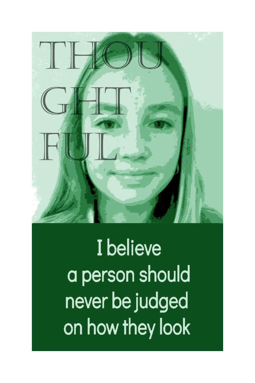 “Under the guidance of art teacher Kurt Nicaise, students at Saint Ursula Academy made “selfies” and combined them with self-chosen strong personal characteristic or trait. Based on the prompts for the SOS Peace and Justice show, they learned about Non-war Violence, Gender Discrimination, Discrimination, and Inequity. They then wrote personal Statements of Conviction on these topics and chose their most authentic to include in their artworks.”