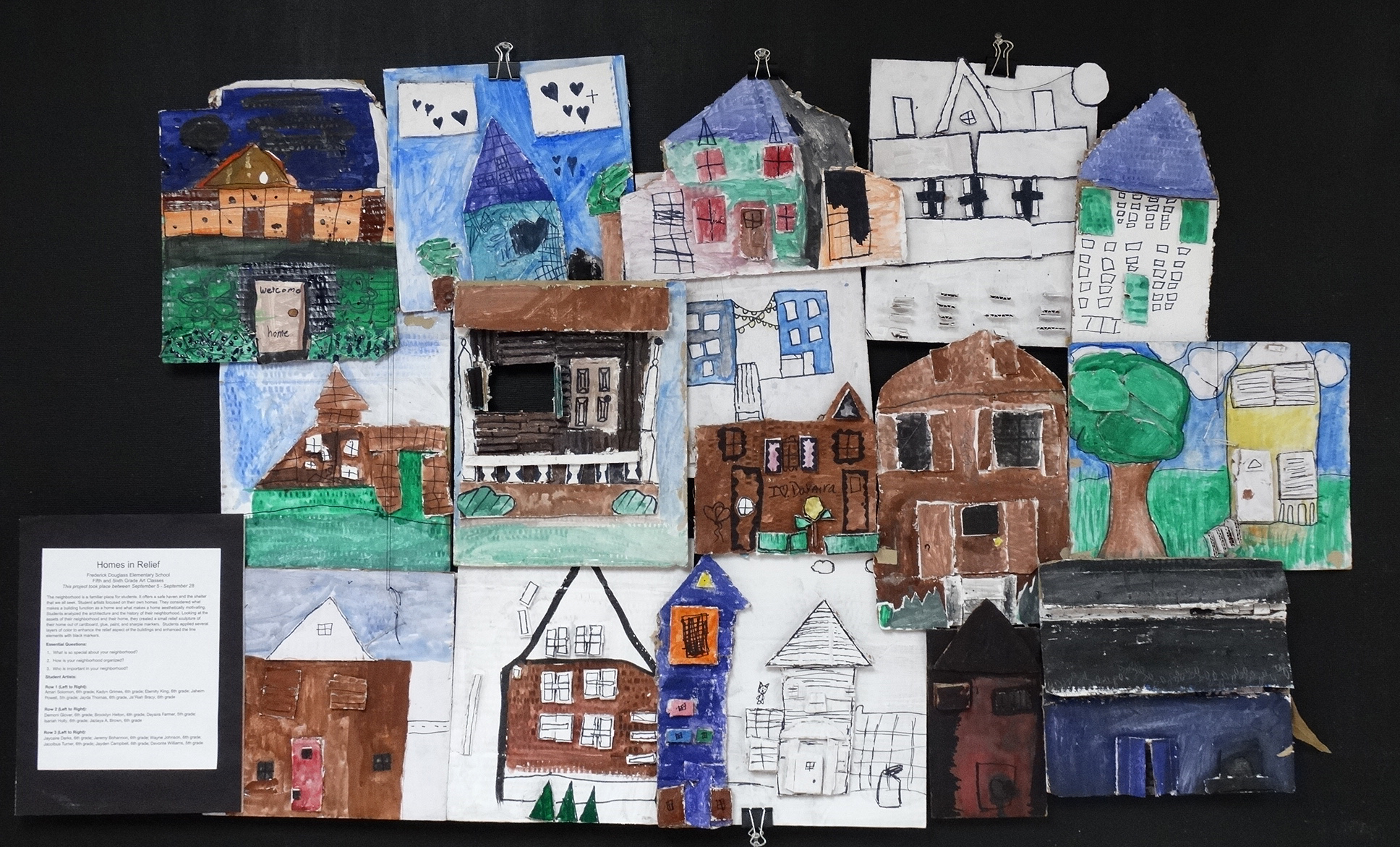 “The neighborhood is a familiar place for students. It is an image of a safe haven and represents the shelter we all seek to have. Guided by art teacher Katherine Smith, 5th and 6th grade students at Frederick Douglass Elementary were asked to focus on their own homes. They considered what makes a building function as a home and what makes a home aesthetically motivating. They analyzed the architecture and the history of their neighborhoods and looking at their assets, they created a small relief sculpture of their home out of cardboard, tape, and glue. “