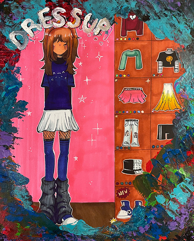 “I depicted the issue of fast fashion in my piece because I love clothing. As I got older, I learned about the phenomenon of fast fashion and how it impacts our world. I researched about the environmental and social impacts of this topic, and learned how much harm it inflicts on our planet. Many people aren’t aware that fast fashion is not a long-standing issue. In fact, it has only become a fierce issue in the past ten years. Did you know that every single year, 92 million tons of textiles are thrown in the landfills? This is equivalent to an entire garbage truck filled to the brim with discarded clothes. In many countries, especially America, we create this idealization of having what you want, when you want, how you want it. Unfortunately, it comes with an insanely hefty cost that leaves you wondering if it’s worth it. In my artwork, I took inspiration off of many little girls’ dress-up games, with bright graphics and a variety of fashionista clothing choices. Choosing clothes that are trendy at the moment shows my hope that when you look at this piece in the future, the clothes shown won’t even be popular anymore.”