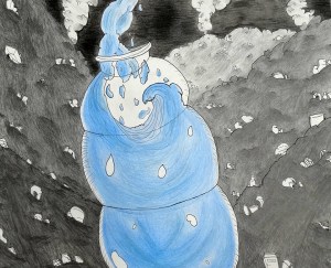 What I drew was a very colorful plastic bottle water being filled with water, surrounded by plastic mounds and smoke billowing into the darkened sky. This was to better represent the waste and environmental hazard that is used to make bottled water and how the manufacturers cover up their crimes. The plastic bottled water is the only thing in color, referencing how companies only focus on their products and not on the waste produced. Hatching is making lines close together to have a shaded effect on your piece. The hatching on the bottled water helps make it stand out more compared to the rest of the piece. I also used line weight, which is to use different sized ink pens to give a sense of depth. While the colored pencils were used on the water, the graphite was used on the sky and background.”