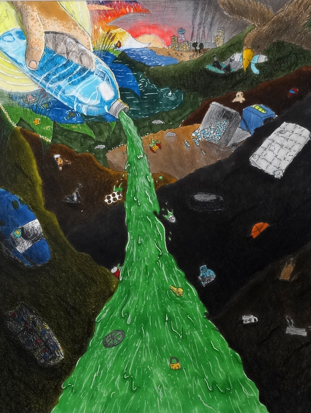 The symbolism I used is that a hand from the sky is pouring water from a waterbottle. The water that is poured, however, is nasty, showing what is really in the water that’s sold. If you use UV light on the water, you’ll see little lines in it. These lines represent plastic particles found within water that’s sold.”