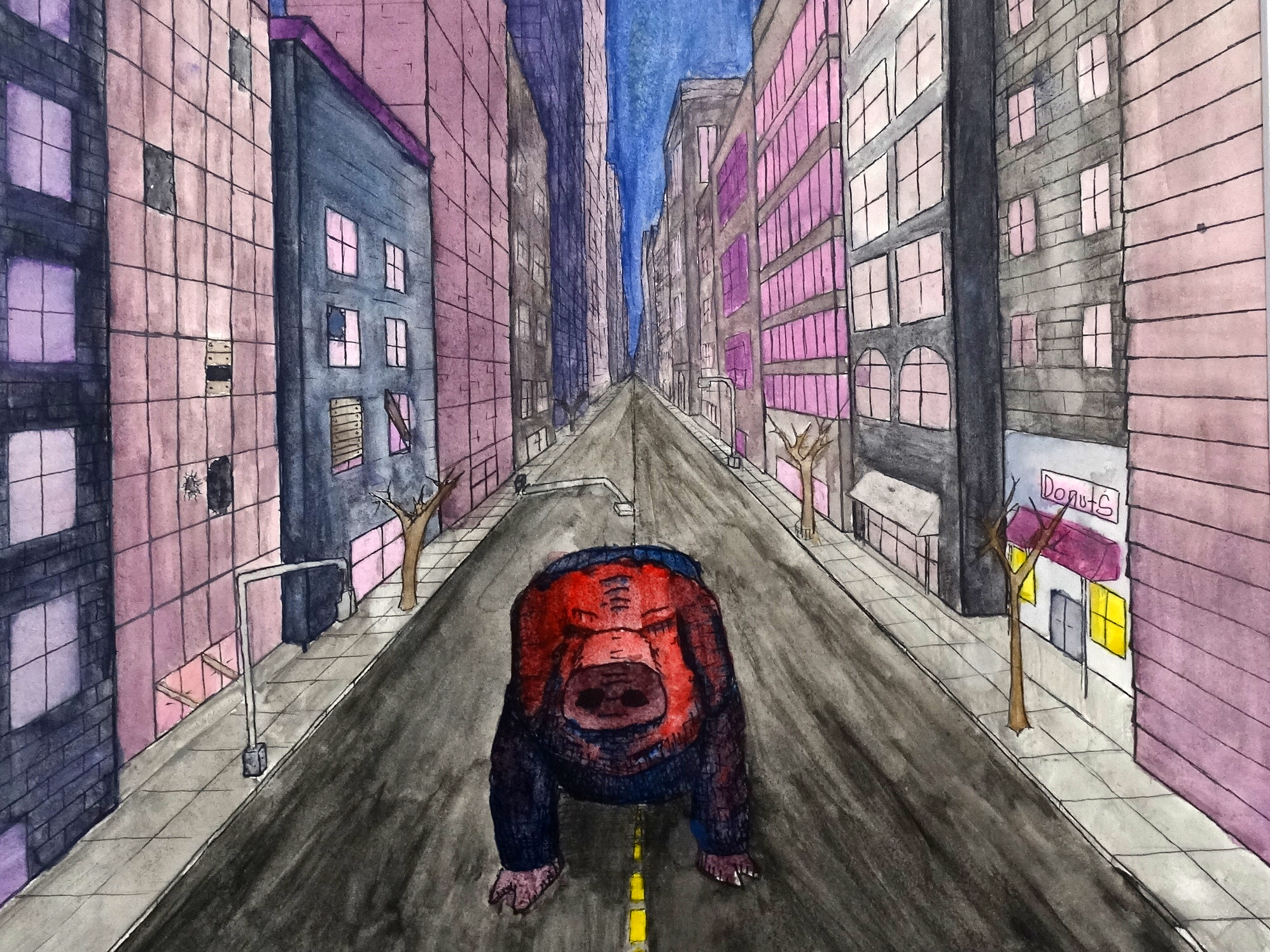My piece depicts a pig standing strong in the middle of an urban neighborhood. Watercolors and fine line detail were used. I wanted the neighborhood to appear broken down to represent the feeling of distress and show how police violence is higher in impoverished areas. I used colors very carefully in this piece. The grey and purple of the buildings represents fear and helplessness, the red and blue pig was to show how it expresses dominance and power, while the sky is a color called “future dusk” that is meant to express a hope for a better future. The justice system is flawed and can cause more harm than good. It can feel like a lost cause, but please go out and vote.”