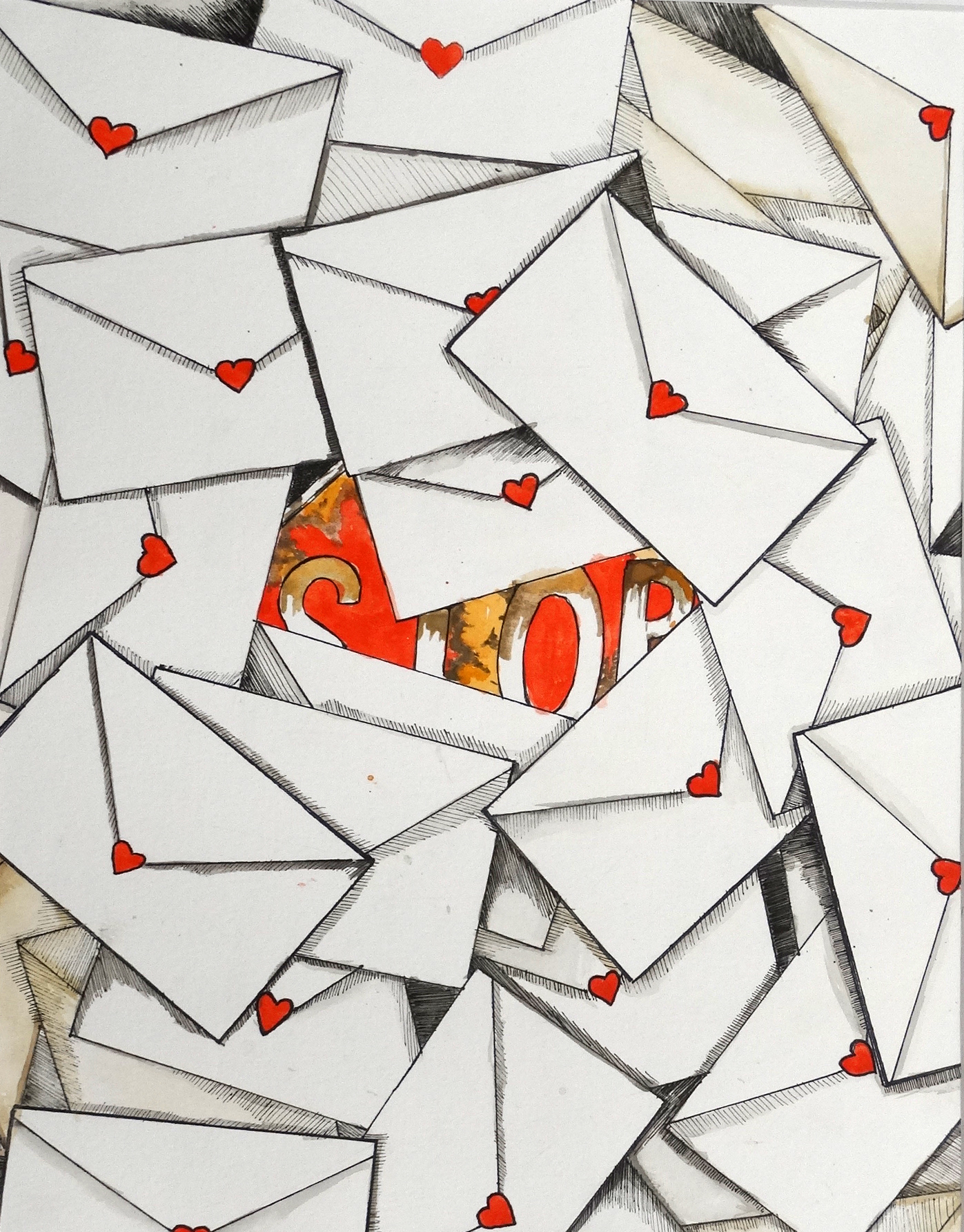 “We constantly see in movies, TV shows, or read in texts the following words “but I love you”, “please” “don’t you love me?” to drown out a “no”. These are the words I chose to show in my piece. In my piece, the first thing you might notice is the rusty stop sign in the middle. It’s not out, super noticeable, but you can tell it’s there. The second thing to catch your eye will be all the love letters covering the “stop”, most of the signs already covered. Some are older looking, tinted yellow and there’s more underneath than what you first see. My piece, putting the dots together, is about sexual harassment, and how “love” constantly drowns out “no” and “stop”. For more symbolic imagery, I used watercolor. To show a run-down, bleed through effect. I used fine lines to bring out some details in the ‘love’ letters. This subject has an impact on me, because the action represented in this piece has happened to me. It has happened to people I love and will unfortunately continue to happen if people choose to ignore it.”