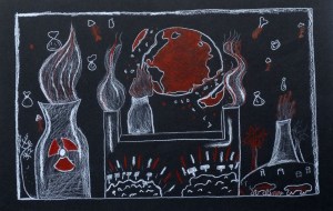 “Under the guidance of art teacher Matt Reed, stdents grades 9 to 12 at Princeton HS studied the work of Keith Haring, an artist known for using simple cartoons to communicate with the viewer. They drew something with a positive message or to address a social issue. They used white and red colored pencils on black paper, similar to the color scheme in some of Haring’s pieces. The project gave them a better understanding of how art can be used as a vehicle for personal or political expression.”