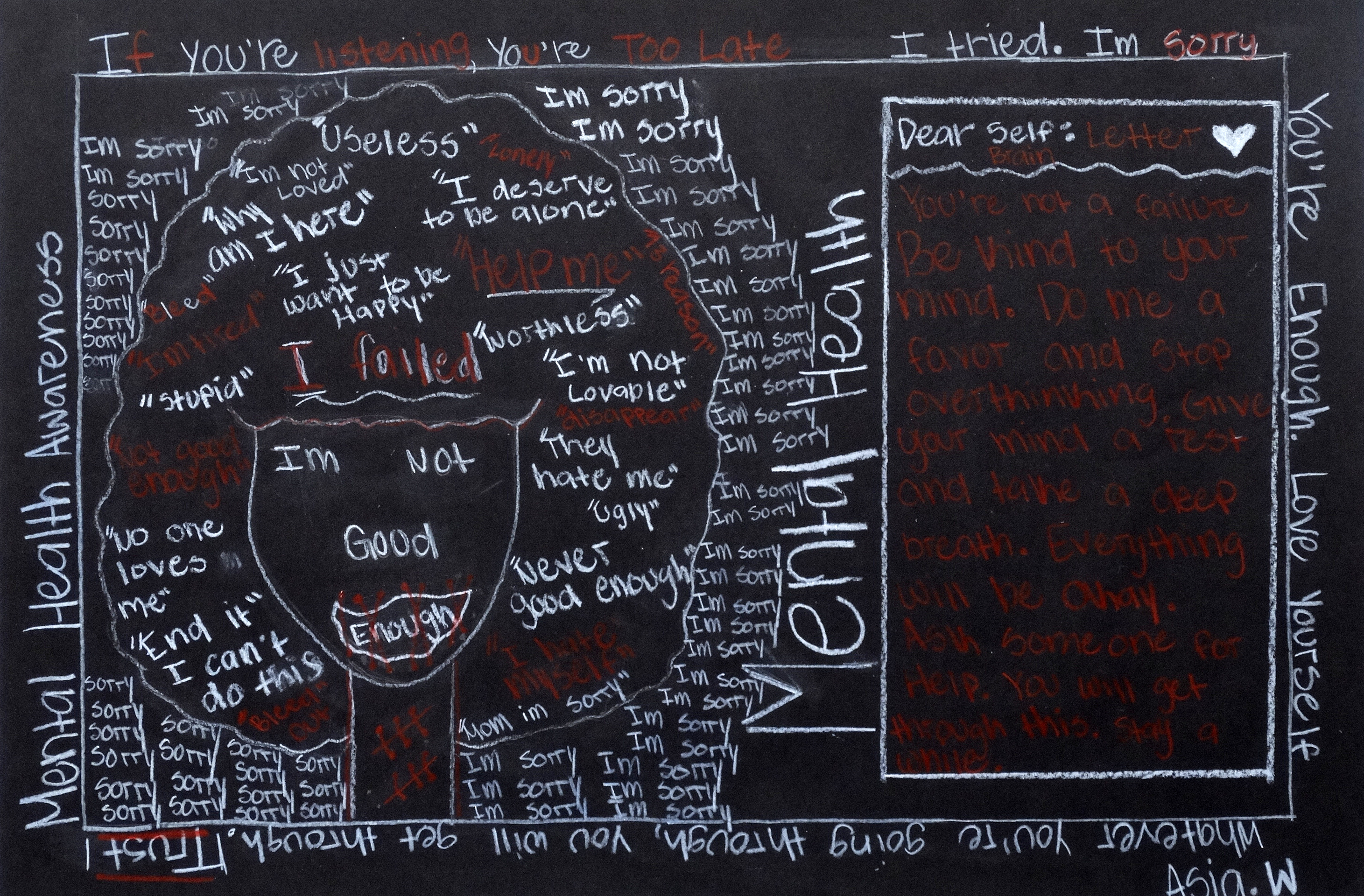“Under the guidance of art teacher Matt Reed, stdents grades 9 to 12 at Princeton HS studied the work of Keith Haring, an artist known for using simple cartoons to communicate with the viewer. They drew something with a positive message or to address a social issue. They used white and red colored pencils on black paper, similar to the color scheme in some of Haring’s pieces. The project gave them a better understanding of how art can be used as a vehicle for personal or political expression.”