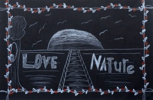 white and red prismacolor pencils on black paper; 15×20″