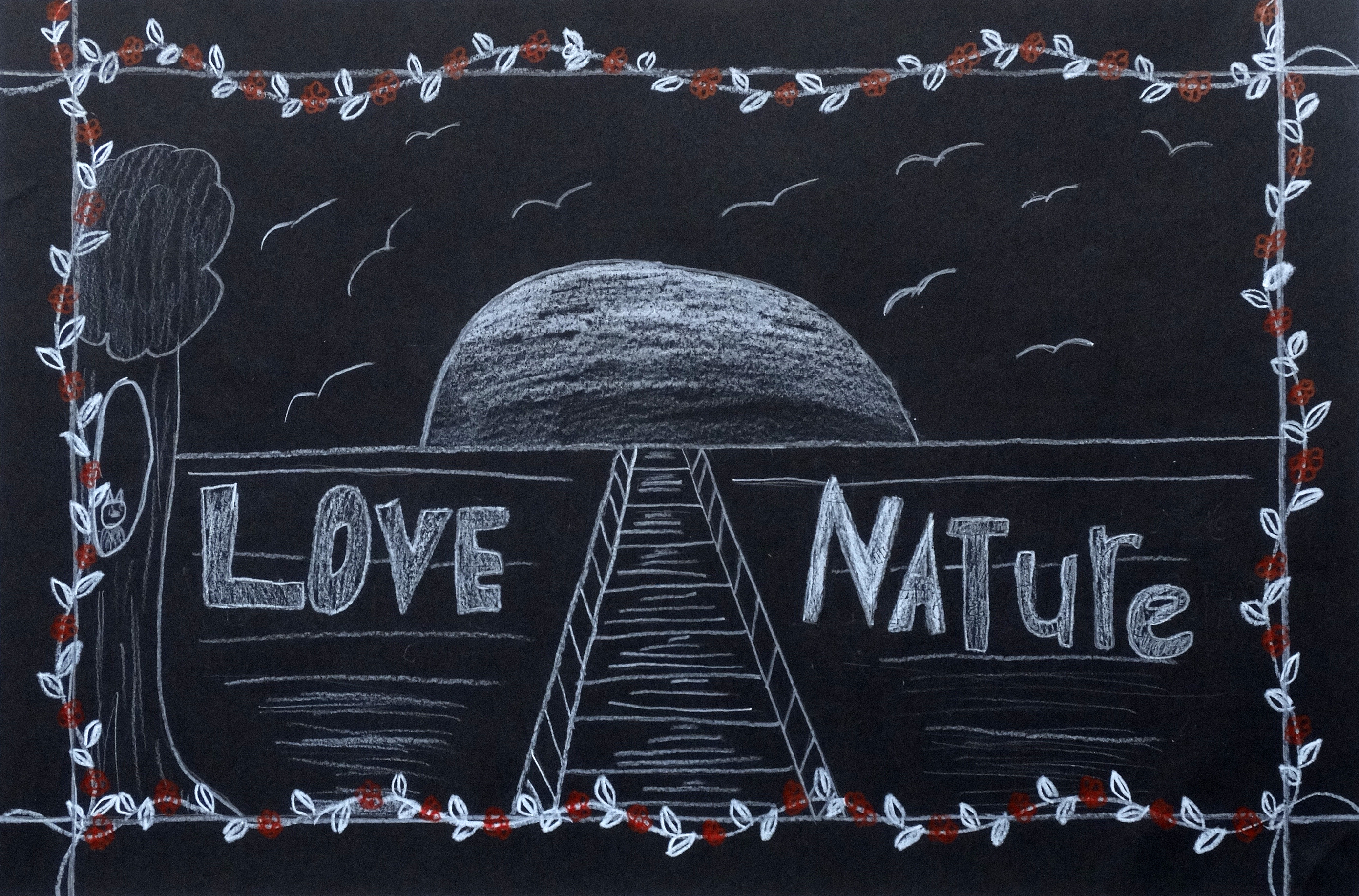 “Under the guidance of art teacher Matt Reed, stdents grades 9 to 12 at Princeton HS studied the work of Keith Haring, an artist known for using simple cartoons to communicate with the viewer. They drew something with a positive message or to address a social issue. They used white and red colored pencils on black paper, similar to the color scheme in some of Haring’s pieces. The project gave them a better understanding of how art can be used as a vehicle for personal or political expression.”