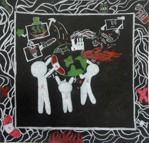 “Under the guidance of art teacher Melissa Ambs students learned about the graffiti style artwork of Keith Haring, and created a drawing in a similar style using symbolic imagery to communicate a message based on a social issue.”