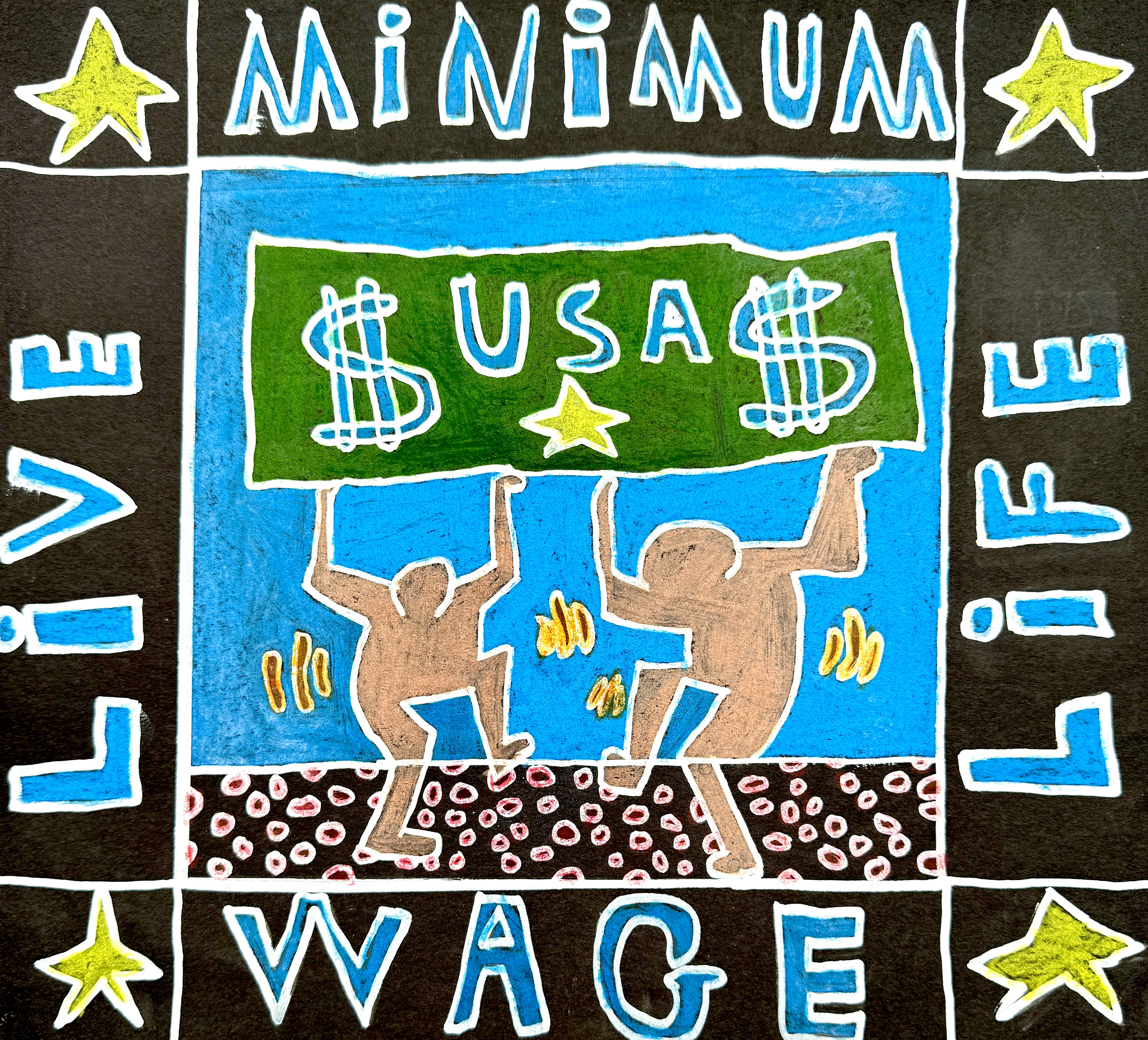 “Inspired by Keith Haring’s playful style, my artwork focuses on the urgent issue of raising the minimum wage. The central image features two figures lifting a large dollar bill, symbolizing the collective effort to elevate wages for workers. Their joyful dancing conveys hopefulness and the desire for a better life, reflecting the positive impact that fair pay can have on individuals and communities. Through this piece, I aim to highlight the importance of economic justice and inspire viewers to support initiatives that promote financial equality and dignity for all.”