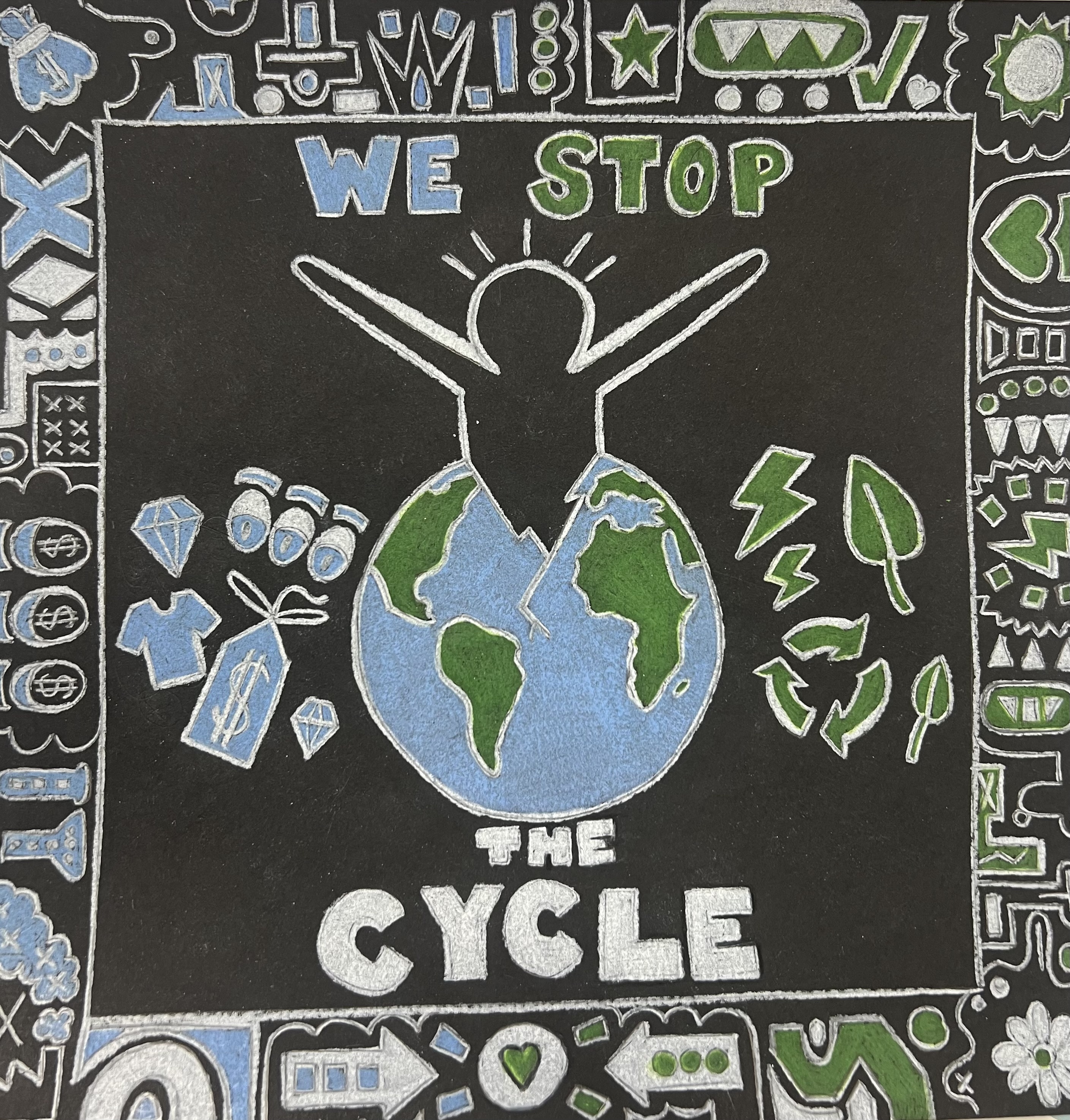 “Under the guidance of art teacher Melissa Ambs students learned about the graffiti style artwork of Keith Haring, and created a drawing in a similar style using symbolic imagery to communicate a message based on a social issue.”