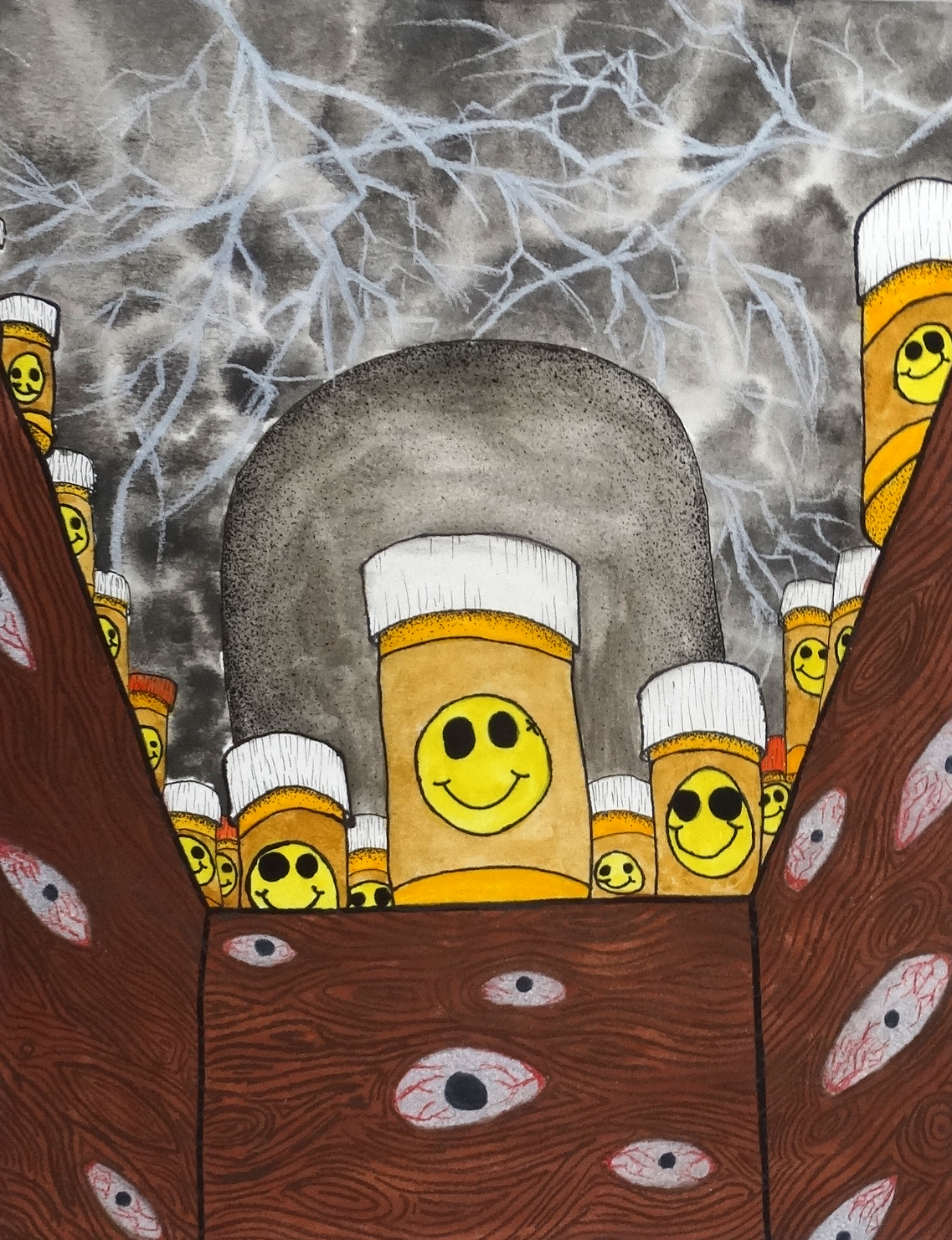 “We all see drug addiction one time or another. Drug addiction fills our community with a bad light. I made “Friends to the End” to show how bleak drug addiction can go. I used colored pencils, and Watercolor paint. “Friends to the End” shows the view of someone looking out from their grave, it shows a tombstone and in front of the tomb are lots of smiling pill bottles, the sky is gray with lightning strikes, the walls of the coffin are dotted with staring eyes always watching within the wood grain. The sky is gray to show how dark and depressing the truth of Drug addiction is, the bottles smile to show the joy they can bring you but the truth of it being that’s all that is happy in the piece. Drug addiction can take the lives of those we love. We all see it but it can be a hush hush topic and most try to ignore it. But it’s today’s world and we must put an end to the heartache of Drug addiction.”