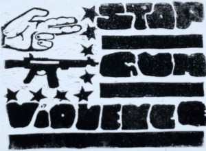 “My print addresses the prevalence of gun violence in America. This topic is important to me because gun violence in schools is becoming more and more common. To demonstrate this, I created a print that is in the form of an American flag. The words “STOP GUN VIOLENCE” form the stripes of the flag and the stars border two guns. One is a literal gun