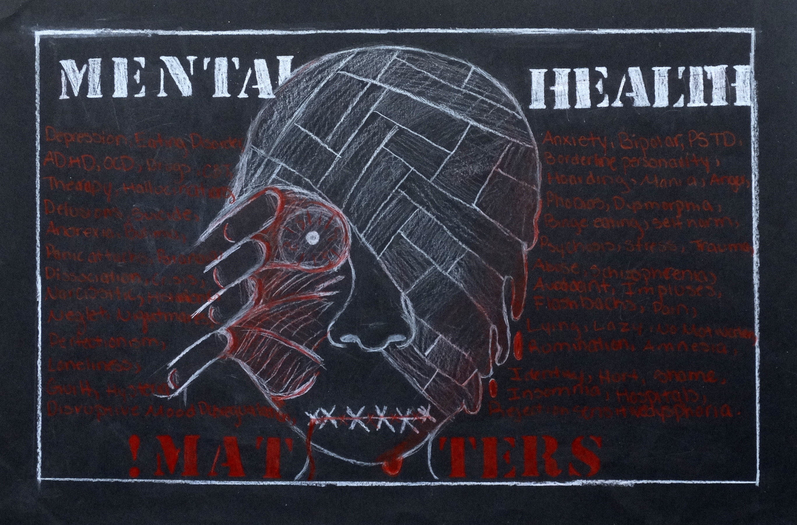 “Under the guidance of art teacher Matt Reed, stdents grades 9 to 12 at Princeton HS studied the work of Keith Haring, an artist known for using simple cartoons to communicate with the viewer. They drew something with a positive message or to address a social issue. They used white and red colored pencils on black paper, similar to the color scheme in some of Haring’s pieces. The project gave them a better understanding of how art can be used as a vehicle for personal or political expression.”