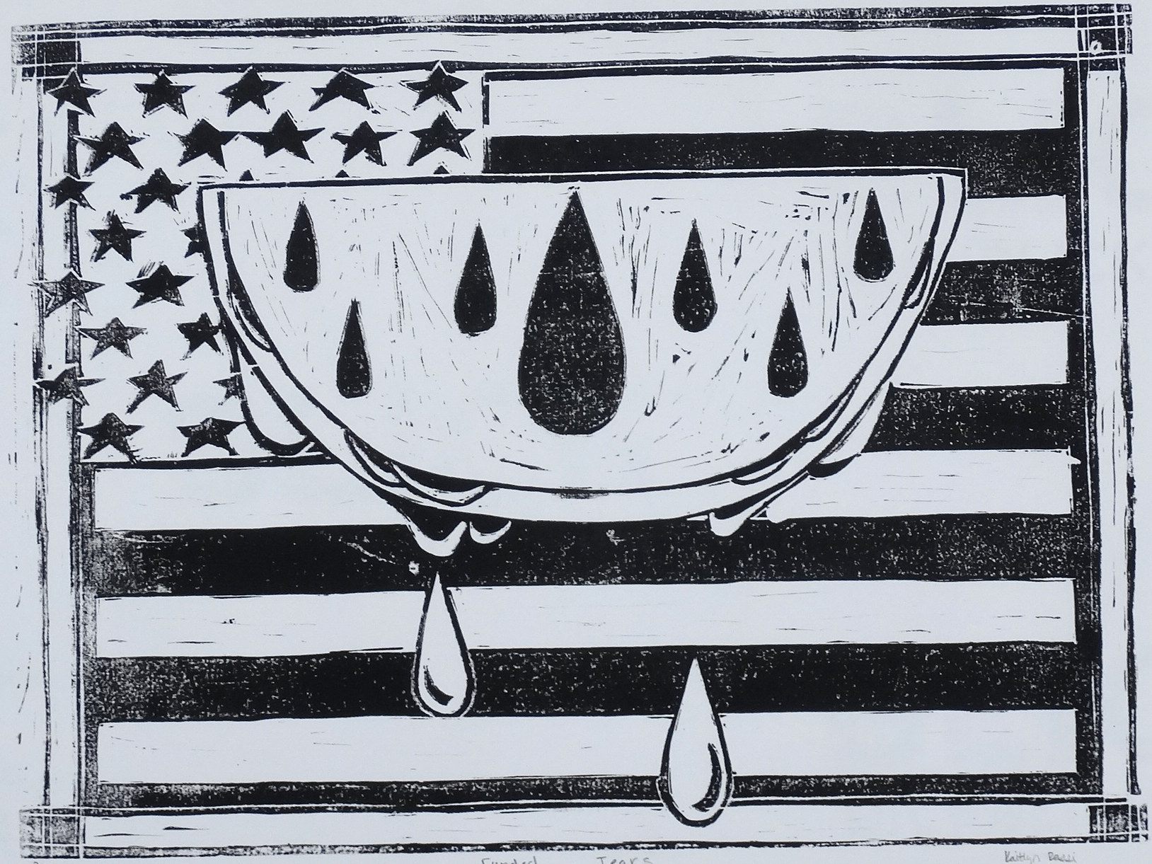 “My work, Funded Tears, brings awareness to the Genocide that is currently occurring in Gaza, Palestine, and the U.S. funds that are being sent to Israel to fund their assaults on the Palestinian civilians. Throughout my work I include symbols of the Palestinian resistance and culture such as the Watermelon and my border being one of the three patterns from the Keffiyeh. The watermelon represents the Palestinian people because when Israel banned the Palestine flag, Palestinians used the watermelon to represent themselves because it has the colors of their flag. The Keffiyeh pattern I chose borders the other patterns representing the history and ancient trading routes that would travel through Palestine, with this it shows the persistence that the Palestinian people have endured. Finally, to show the United States continued involvement and backing of Israel’s assault on Palestinian civilians for 15 months I incorporated a U.S. flag as my background.”