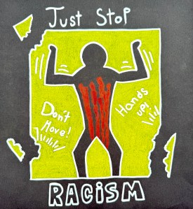 “Inspired by Keith Haring’s bold style, my artwork addresses the urgent issue of racism. The central figure is a Black man with his hands up, symbolizing innocence and vulnerability, yet he has been shot by police. The stark contrast of the dark figure against a bold yellow background emphasizes the tragedy and injustice of such incidents. Vibrant colors and dynamic lines capture the pain and anger felt by many. Through this piece, I aim to raise awareness, provoke conversation, and advocate for the end of racial violence and systemic injustice.”