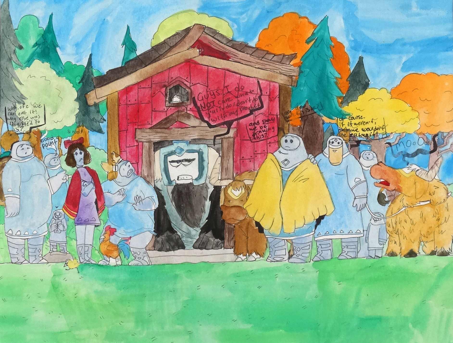 “Do you think people should be drinking / consuming dairy products? As for me, I’m not sure. Dairy is something we need, right? It helps strengthen our bones and teeth, and provides us with Calcium, a mineral that helps maintain our bone health, and reduces the risk for certain diseases or infections like Osteoporosis. The art I drew for my Social Justice piece is a group of people deciding on whether or not they should be consuming Dairy (specifically from animals) because of the way milk is being made / processed. I drew one big, farm-like creature in a Barn telling the others that they don’t care what the people do with their product. The mediums I used were ink, by drawing over the sketch, and inking it with Micron pen, and watercolor, by using a watercolor palette and painting over top of it. As for my imagery, I used a Barn and cows because the animals we get our milk from come from Barns all over the country, whether it’d be an all-Cattle farm, or an all-Goat farm. My overall creation for this piece is deciding if someone should really be drinking 3 cups of milk a day. Why not 4 or 5? Why not less than three? Why are we using milk from animal mothers to sustain ourselves? Is it selfish? Or.. something else?”