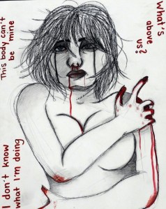 “This Body is a piece dedicated to trafficking and sexual assault. The figure, sketched out messily, holds herself as she looks up to the sky, as if to wonder where she has gone wrong. The sketchiness of the piece depicts the botched memory of her assault and symbolism of how her body is no longer hers. The piece has various lyrics surrounding the figure, all illustrating her thoughts. Similarly, she is also bloodied up, likely having just come out of trafficking. She holds her bloodied shoulder, matched by her bloody nose, a symbolism of violence from an abuser. The eyes of the figure contain the most detail as a way of showing the audience that she is deeply traumatized by what has happened to her. The main idea of This Body is to bring awareness to women who are trafficked and sexually assaulted, along with the fear of speaking up.”
