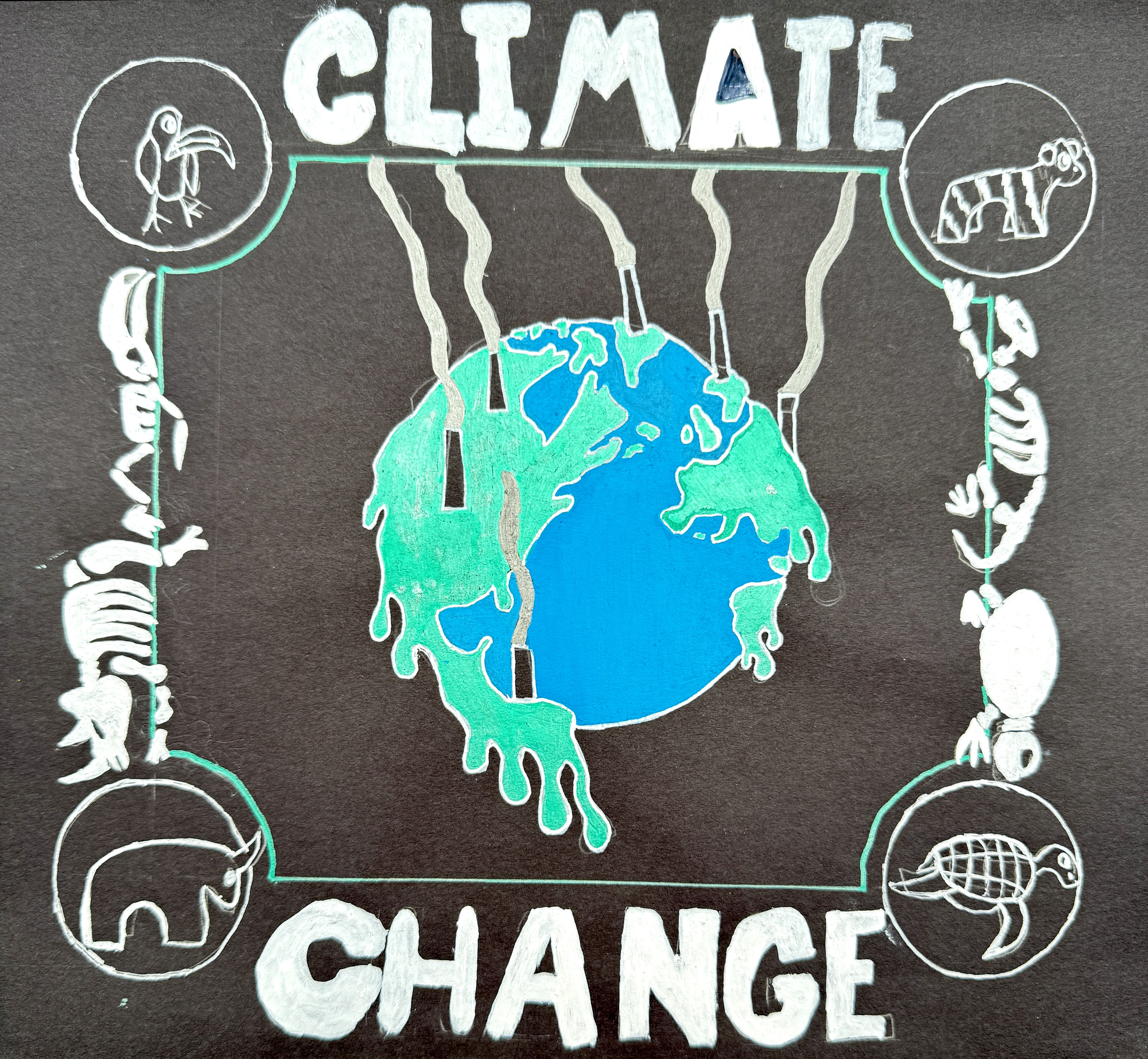 “Inspired by Keith Haring’s impactful style, my artwork tackles the pressing issue of climate change. At the center is a melting globe, symbolizing our planet’s distress, surrounded by factory smoke stacks spewing carbon into the atmosphere. Along the border, the skeletons of animals represent the devastating effects of climate change on wildlife. Through vibrant colors and dynamic lines, I aim to illustrate the destructive impact of human actions on the Earth. This piece urges viewers to recognize the severity of climate change and take action to protect our environment.”