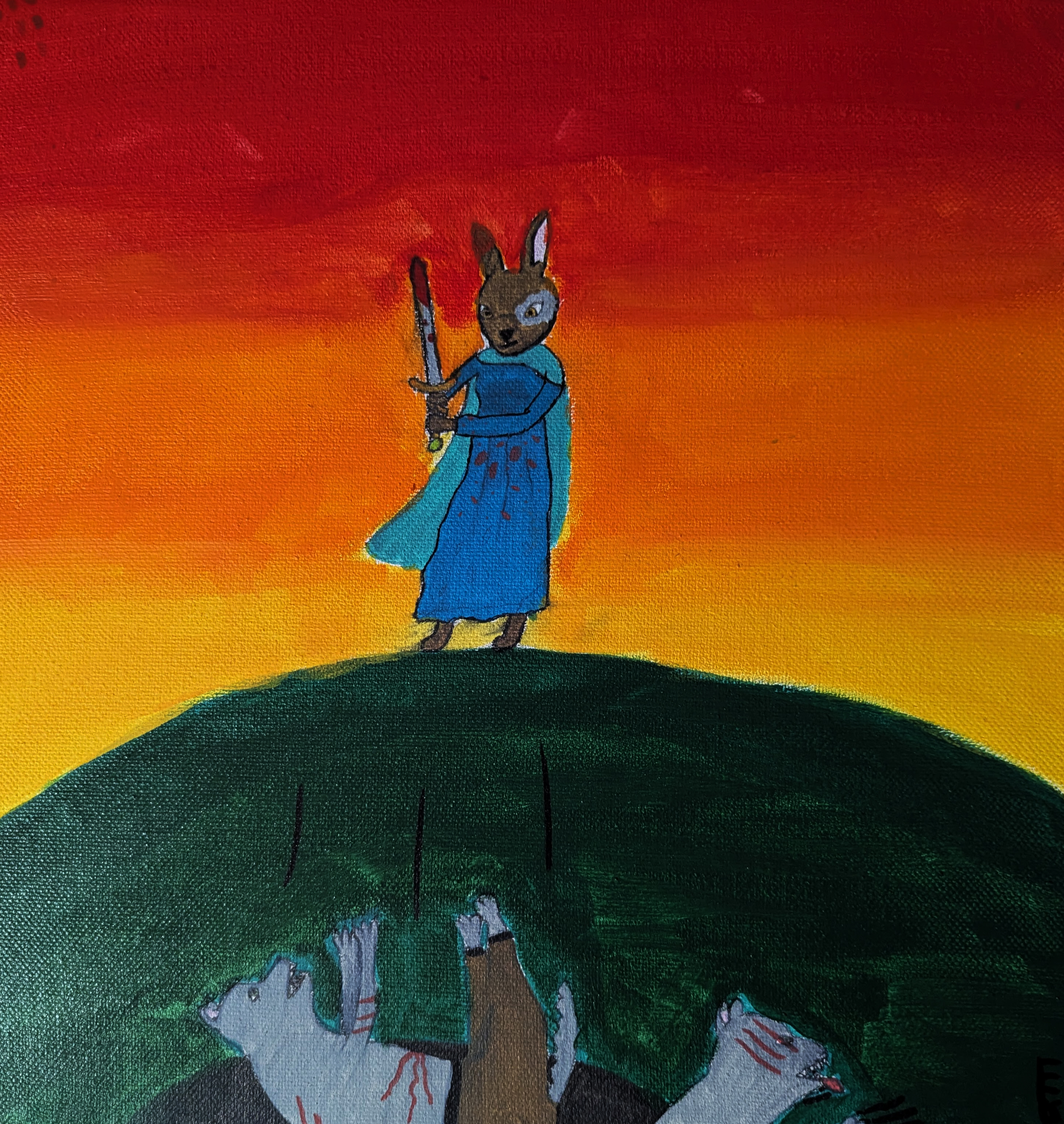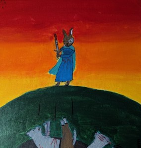 “In my painting, the rabbit is being loyal and bringing justice to her king by standing up for what’s right and killing the enemies. The wolves represent Satan’s soldiers. One of the reasons I painted this, is to encourage Christians everywhere to be bold and stand up for what they believe is right.”