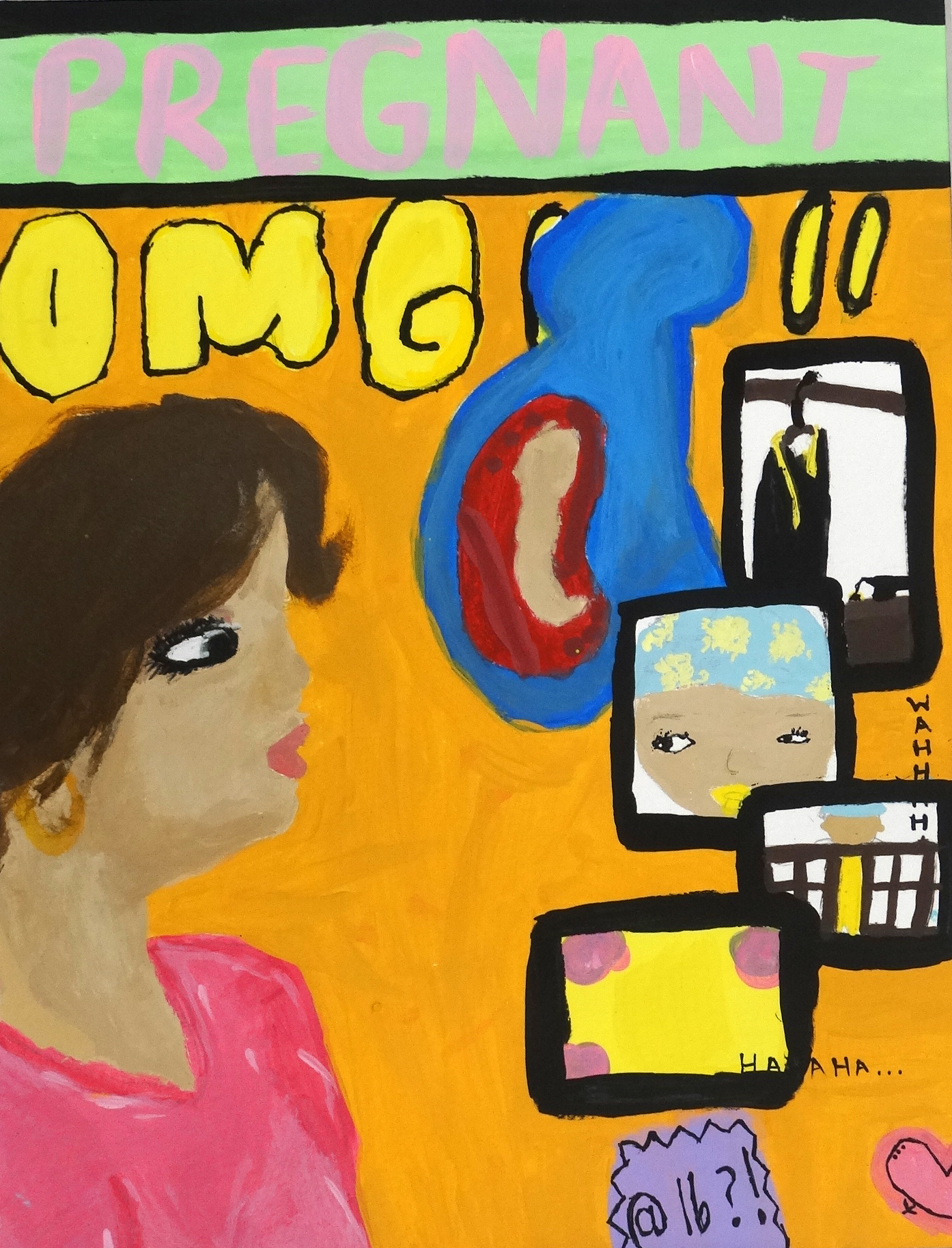 “Every year, millions of teenagers find themselves facing an unplanned pregnancy, a life-altering reality that brings both challenges and choices. Behind every statistic is a real story—young people navigating stigma, responsibility, and the search for support while trying to reclaim their futures. For this piece, I made sure that it expressed sadness and loneliness, but I also hoped for it to look like a magazine cover, bright and colorful, attracting people to it so they wish for dreams like in the magazines. Teen pregnancy is too wished upon for some kids, and the public needs to stop romanticizing it. Babies having babies has always been a sad and discouraged thing in my home because you’re still growing and learning. Teen pregnancy affects individuals on multiple levels, from physical health to emotional well-being and social dynamics. Young mothers often face interruptions in their education, limiting career opportunities and financial stability. They may also encounter social stigma and strained relationships with family or peers. The challenges extend to their children, who are at higher risk for health issues and lower academic achievement. Teen fathers, too, may struggle with their roles and responsibilities, often feeling unprepared for the demands of parenthood. The ripple effect can impact entire families, making teen pregnancy a complex issue that requires compassionate and comprehensive support.”