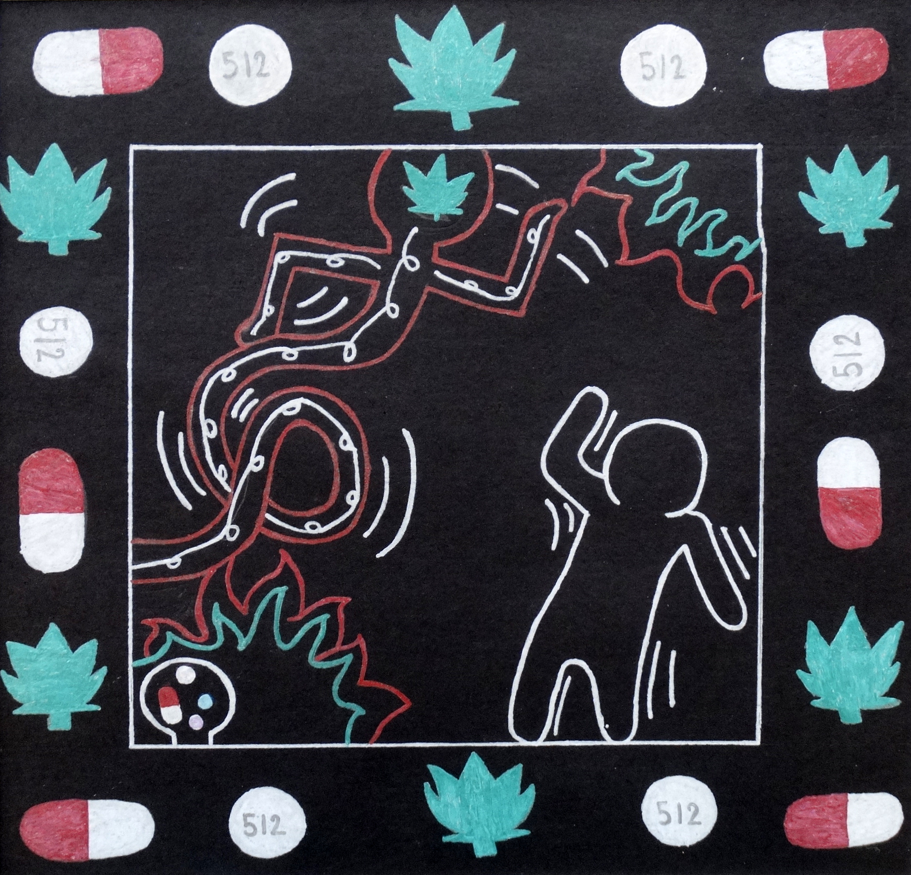 “Under the guidance of art teacher Jamie Schorsch, students learned about the graffiti style artwork of Keith Haring, and created a drawing in a similar style using symbolic imagery to communicate a message based on a social issue.”