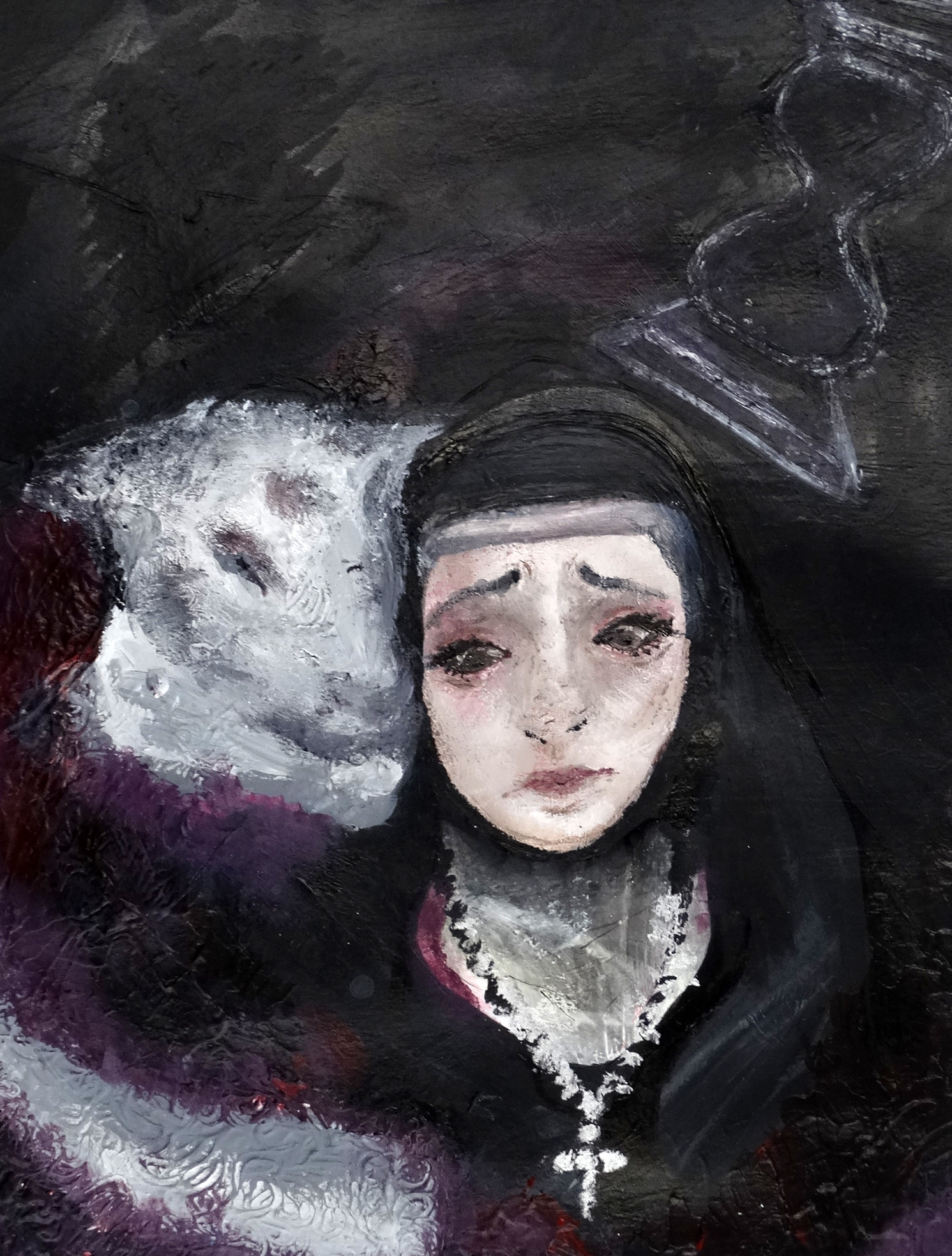 “Have you ever wondered what it would take to be excommunicated from the church? In some places, all it takes is being a woman that wishes to become a priest. To symbolize this social issue, I made an art piece that represents women that were silenced in their wishes to be priests. I painted a lamb behind the woman to represent the sacrifice they go through, an hourglass to represent how long this issue has been going on for, and finally the woman that looks down upon the cross around her neck. I used dark colors and smudged them into the background and all around the centerpiece to emphasize the importance of the symbolism being used. As of today, the issue of women wanting to become priests and not being permitted into the role isn’t talked about and can even be looked down upon if you do so. To have change, society as a whole needs to start thinking about the new and get rid of misogynistic past ways of thinking. Religious roles should not be based upon a person’s sex but by their faith.”