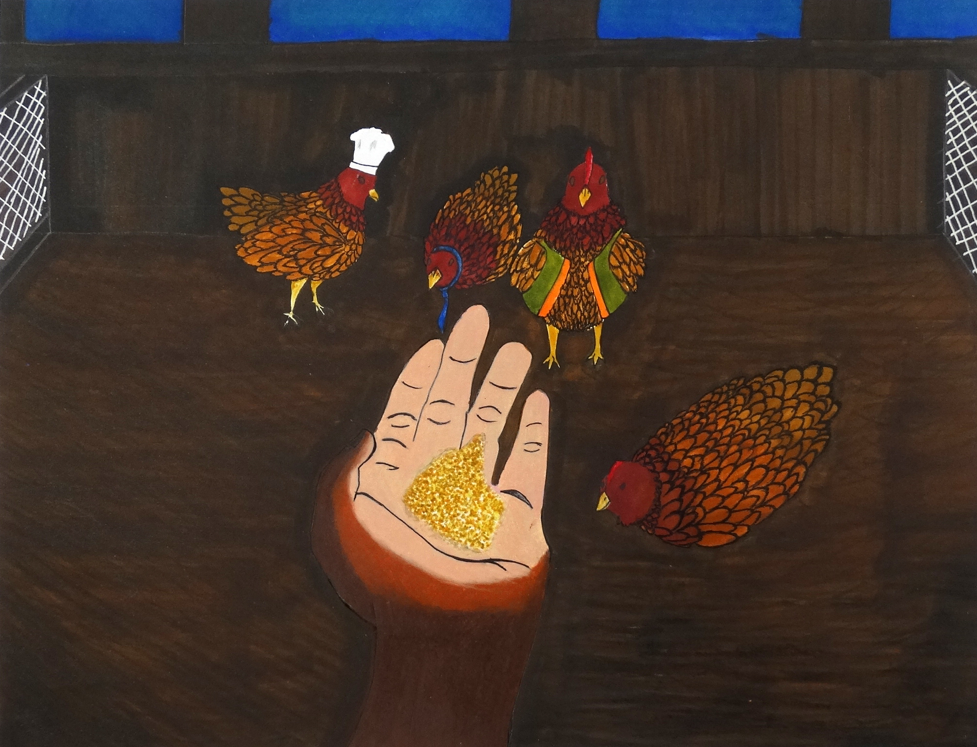 “Whether you like it or not, politics have made their way into so much of everyday life. Every commercial, tv show, and even everyday products have been politicized; and as society has become more socially conscious, it seems like at every turn there’s someone making a think piece on every minor event or topic. Because anti-intellectualism isn’t a physical thing I had to get creative in showing both what it is and how it affects us. Livestock, especially chickens, are often associated with dependence, compliance, and a lack of complex intelligence which are common afflictions of limited access to information. The hand holding the feed represents how under an anti-intellectualism nation, access to information would be limited and most likely incorrect. I used various techniques like line weight, fine line detail, and shading which helped to elevate the overall image. Line weight is the variation of the size of lines to create depth in piece and can be seen most clearly on the hand. There is also a bit of line weight visible on the chickens but they primarily contain fine line detail. I tried to use a more muted color palette to show the dullness of it but I think the colors are a little more vibrant than intended.”
