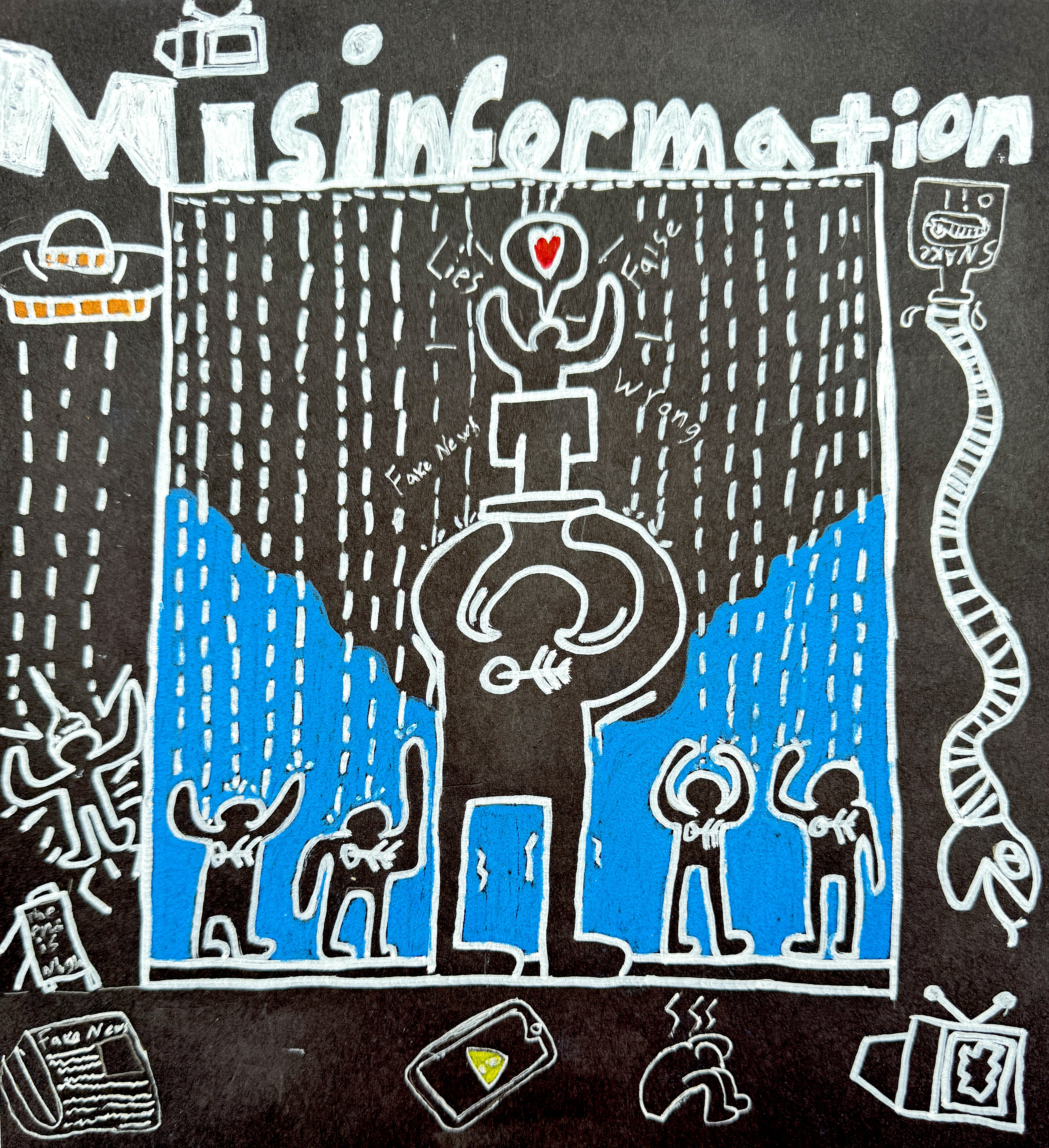 “Inspired by Keith Haring’s vibrant and bold style, my artwork explores the theme of misinformation in today’s digital age. The central figure features multiple “talking heads” emerging like nesting dolls, symbolizing how lies and disinformation fill our minds. These overlapping voices create confusion, making it hard to distinguish fact from fiction. My goal is to raise awareness about the impact of misinformation on society.”