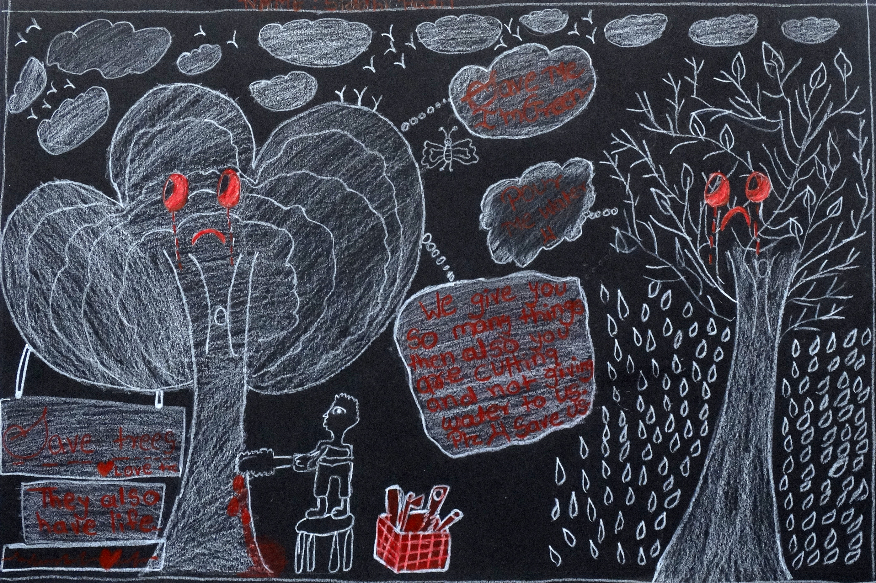 “Under the guidance of art teacher Matt Reed, stdents grades 9 to 12 at Princeton HS studied the work of Keith Haring, an artist known for using simple cartoons to communicate with the viewer. They drew something with a positive message or to address a social issue. They used white and red colored pencils on black paper, similar to the color scheme in some of Haring’s pieces. The project gave them a better understanding of how art can be used as a vehicle for personal or political expression.”