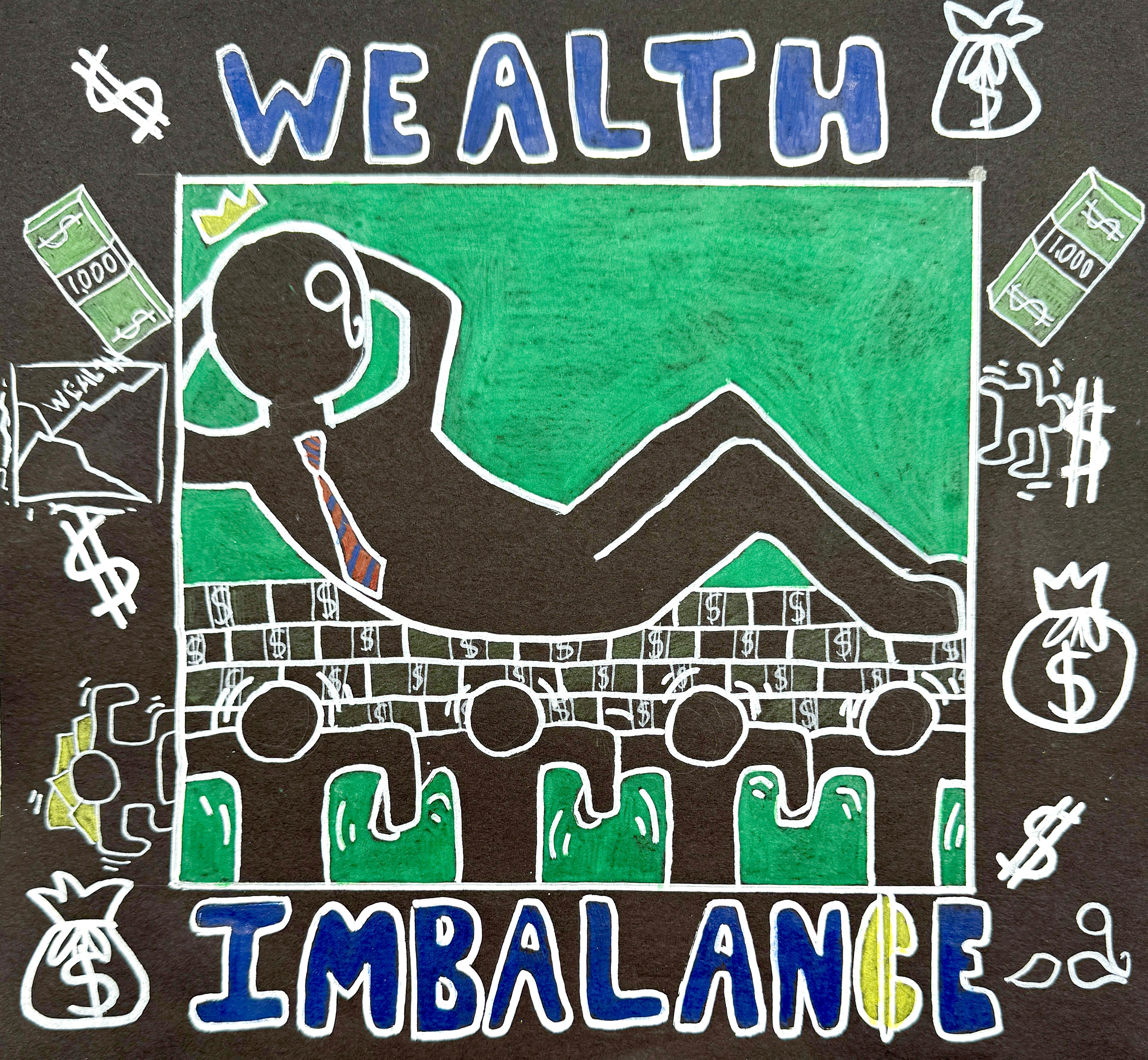 “Inspired by work of Keith Haring’s, my artwork addresses the issue of wealth imbalance. The central figure, adorned with a crown, lounges atop fat stacks of cash, symbolizing extreme wealth and privilege. Surrounding him are smaller figures representing the working class, reaching up to support him, illustrating how the labor of many sustains the fortunes of a few. The strong lines and contrasting colors highlight the stark differences between the rich and the workers. Through this piece, I aim to shed light on the unequal distribution of wealth and encourage viewers to think about fairness and the value of every individual’s contribution to society.”ARTIST BIO: Summer PERRY is a grade 10 student at OHHS.