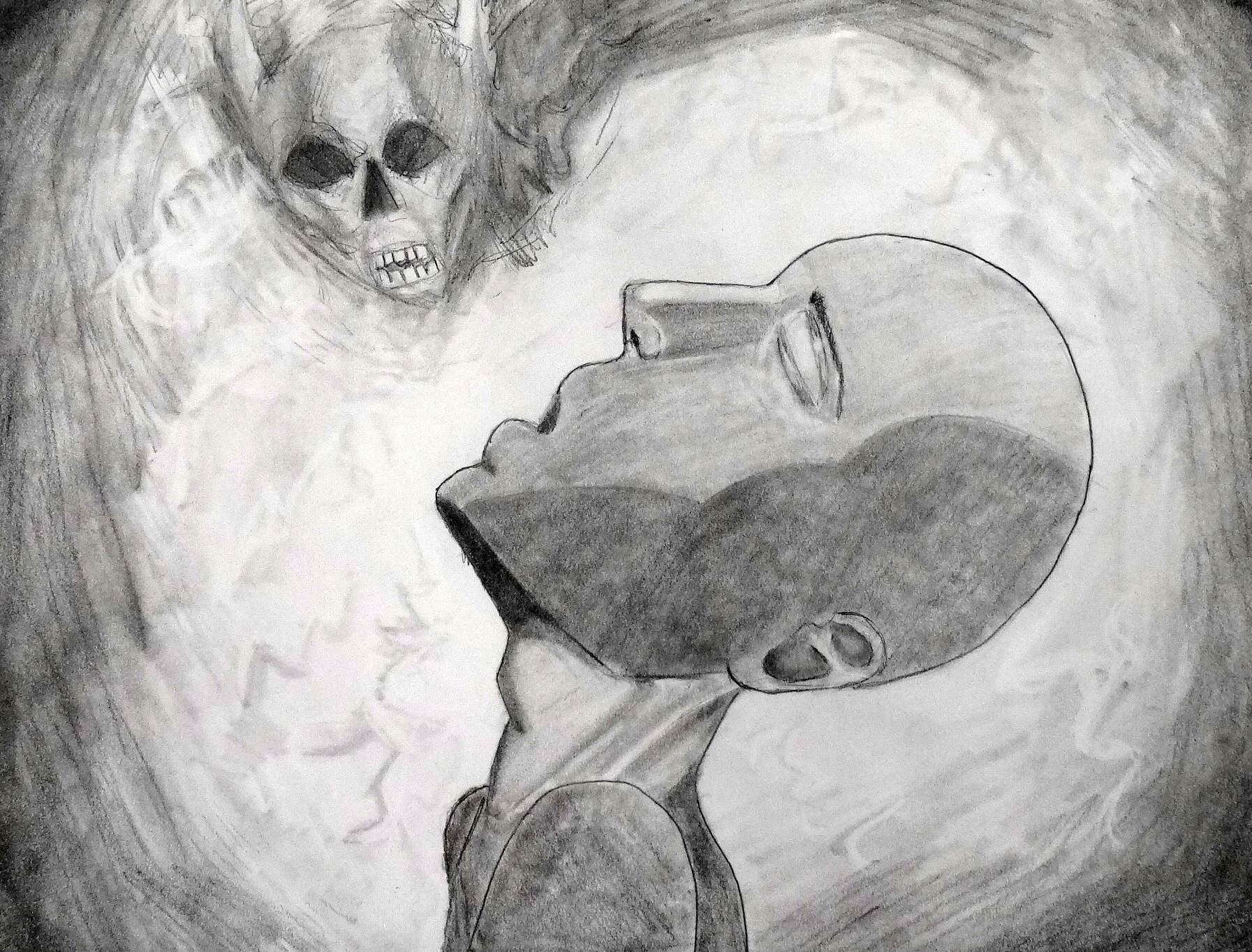 “Have you ever smoked a cigarette or been around someone who smokes them? For my piece about cigarette smoking, I drew a man in the center of a page with his head tilted upwards and his mouth slightly open. Smoke around him but not surrounding him, as there is white space around his head. Above his head is a skull made from the surrounding smoke, symbolizing the effects of smoking. The smoke has got a hold of him like he’s lost, trapped. As for the median, I used graphite to have a smoky-like texture. This topic is crucial to me because my aunt is a big cigarette smoker and because she smokes so much, she had a brain aneurysm and almost passed away. This is scary and I wouldn’t want this to happen to someone else or someone get lung cancer over smoking. This is why I want to convey this message to encourage people to stop.”