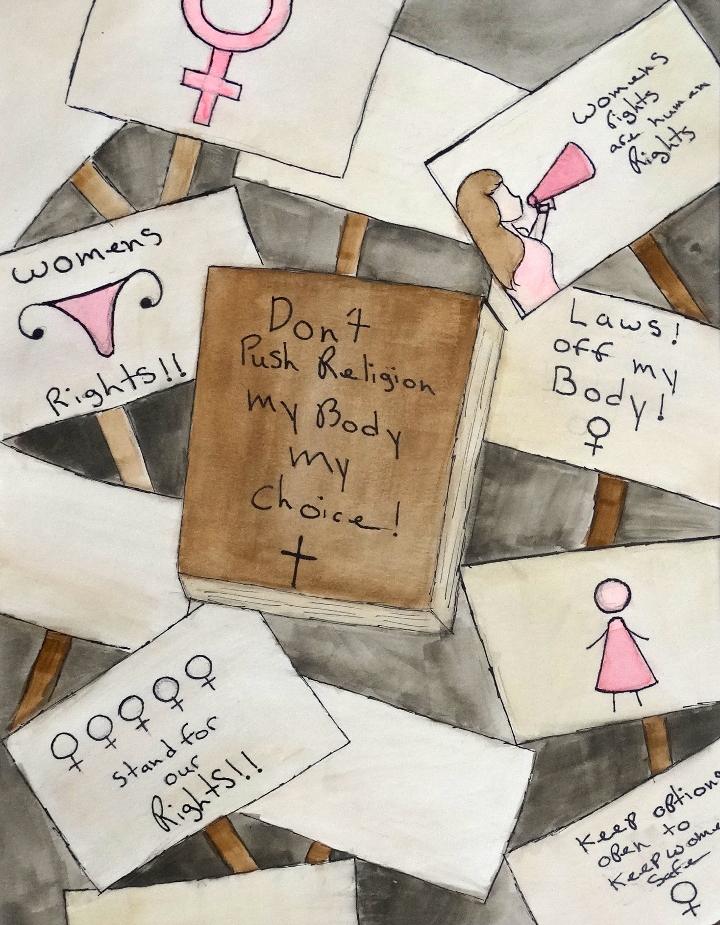 “Do you have a mom, daughter, sister, or know any other women in your life? I know I do and that’s why I chose to do my project on women’s rights. My art piece shows a collage of signs promoting women’s rights, and a book that says don’t push religion. I went for a more rustic look and used watercolor and ink, when using the watercolor I didn’t use a lot of water so the paper looked more old and tired. This subject is so important to me because someone close to me had a medical emergency and had to have a procedure done in order for her to be with us right now and if the laws changed before that i don’t know if i’d still be able to see her right now. This is why I know why we need to keep laws off our body.”