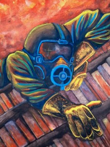 “Have you ever been in an empty library? Seen the molding that can’t be disguised as anything else? It’s like walking into your child’s bedroom after they’ve moved onto college. Only with the knowledge that they’ll never come home to you. I painted a person wearing PPE, more specifically a gas mask climbing up burning book shelves. The person walks into a library and sets it ablaze, burning away decades of history and hundreds of people’s work. They’re climbing their way out as white smoke fills the room and black smoke fills their mask. The knowledge of this library is burning away, but it wants to take you with it. My piece wants to showcase the heartbreak that comes with each and every book lost to history, the pile of grief that stacks higher each time someone’s words are snuffed out and buried.”