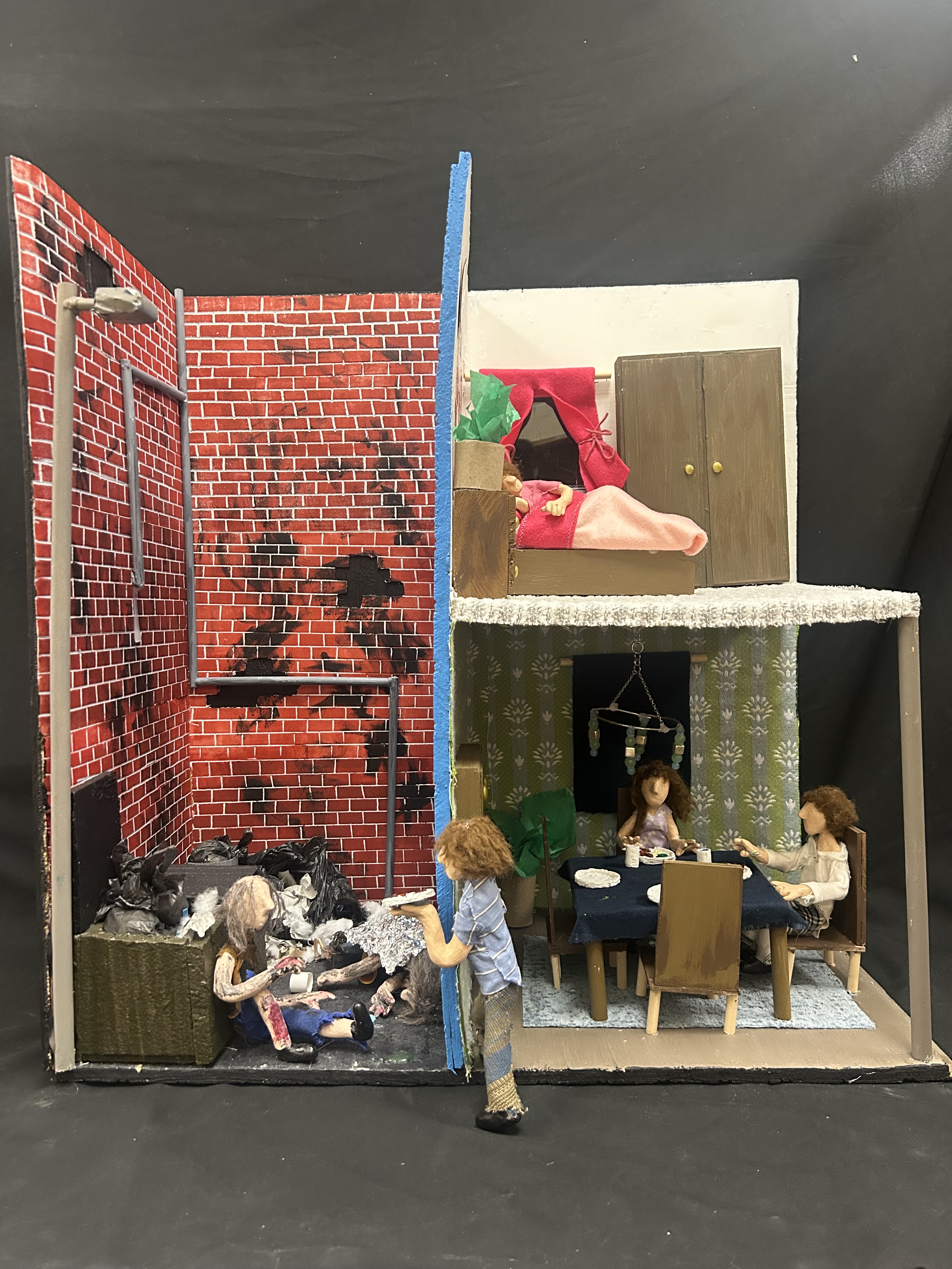 “My piece shows how different two lives can be, even when they are separated by a single wall. The goal was to bridge the gap of differences while showing the closeness between the homeless and those whose needs are met. The bridging of differences is shown through one of the dolls handing his food off to the homeless, as everyone needs to eat. Homelessness is a huge issue in today’s world and we really wanted to show how drastically different people’s lives are yet living so close. We see homelessness in our everyday life, it is a huge issue in today’s world. People can live just a wall apart yet have such different lives.”