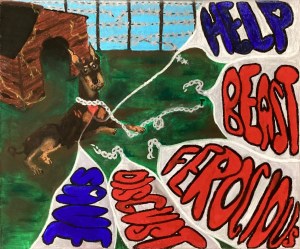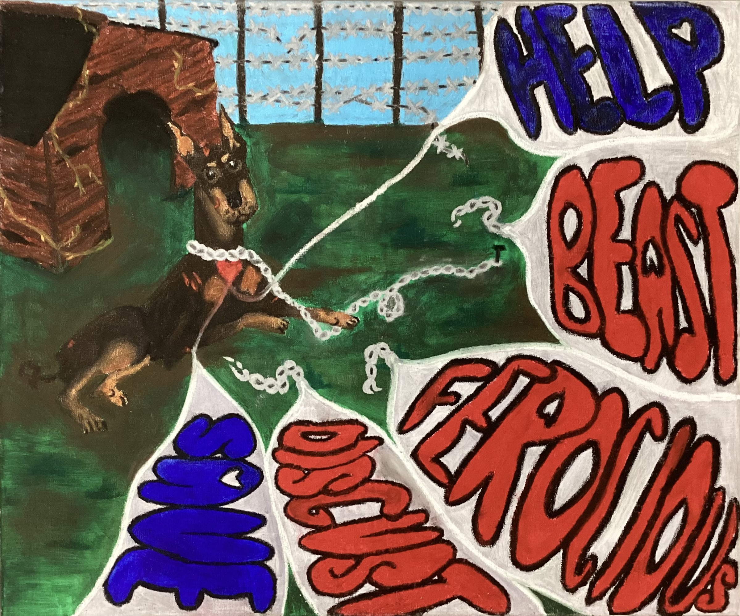 I love this piece as the shading of the Doberman, the barbed wire fence, and the wood pieces making up the dog house give the unkempt feel. Different colors on the Doberman blended together to create the look of fur. The barbed wire fence with some broken and hanging strands of barbed wire adds to the rundown feel. The wood pieces of the dog house show a more broken and dark feeling. Adding more broken boards and the idea of holes in the planks gave a broken effect.”